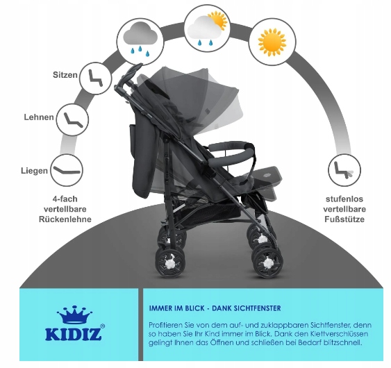 Наша коляска KIDIZ – настоящее облегчение для вас и вашего ребенка. По сравнению с традиционными комбинированными колясками, которые обычно большие, громоздкие и трудные в маневрировании, наша Jogger чрезвычайно компактна, чрезвычайно маневренна и вмещает до 15 кг. Его легко складывать и раскладывать одной рукой благодаря механизму складывания одной рукой, и он поместится в багажнике, даже если багажник вашего автомобиля небольшой. Помимо комфорта, коляска предлагает достаточно места для комфортной прогулки вашего ребенка. Он достаточно большой не только для вашего ребенка, но и для любимой мягкой игрушки. Поэтому ничто не помешает вам вздремнуть во время длительной прогулки.