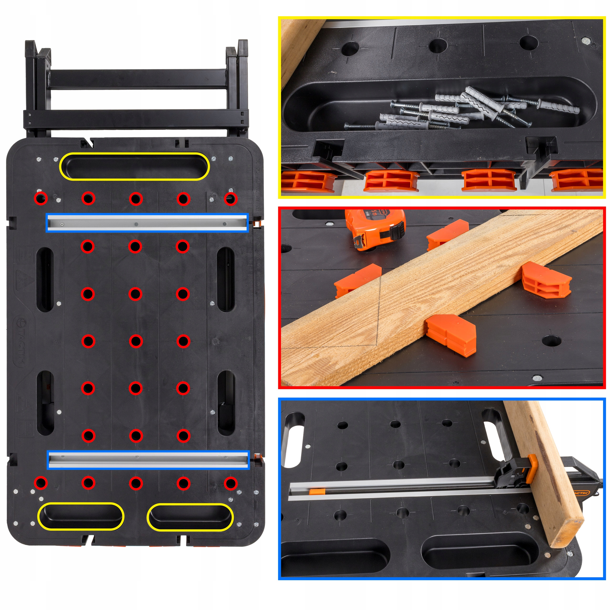 Tactix Workshop Table, была разработана для комфорта и эффективности работы. Оснащены серией отверстий , позволяет легко устанавливать замки для заготовки или сборки дополнительных круглых зажимов, что повышает точность и стабильность во время работы.