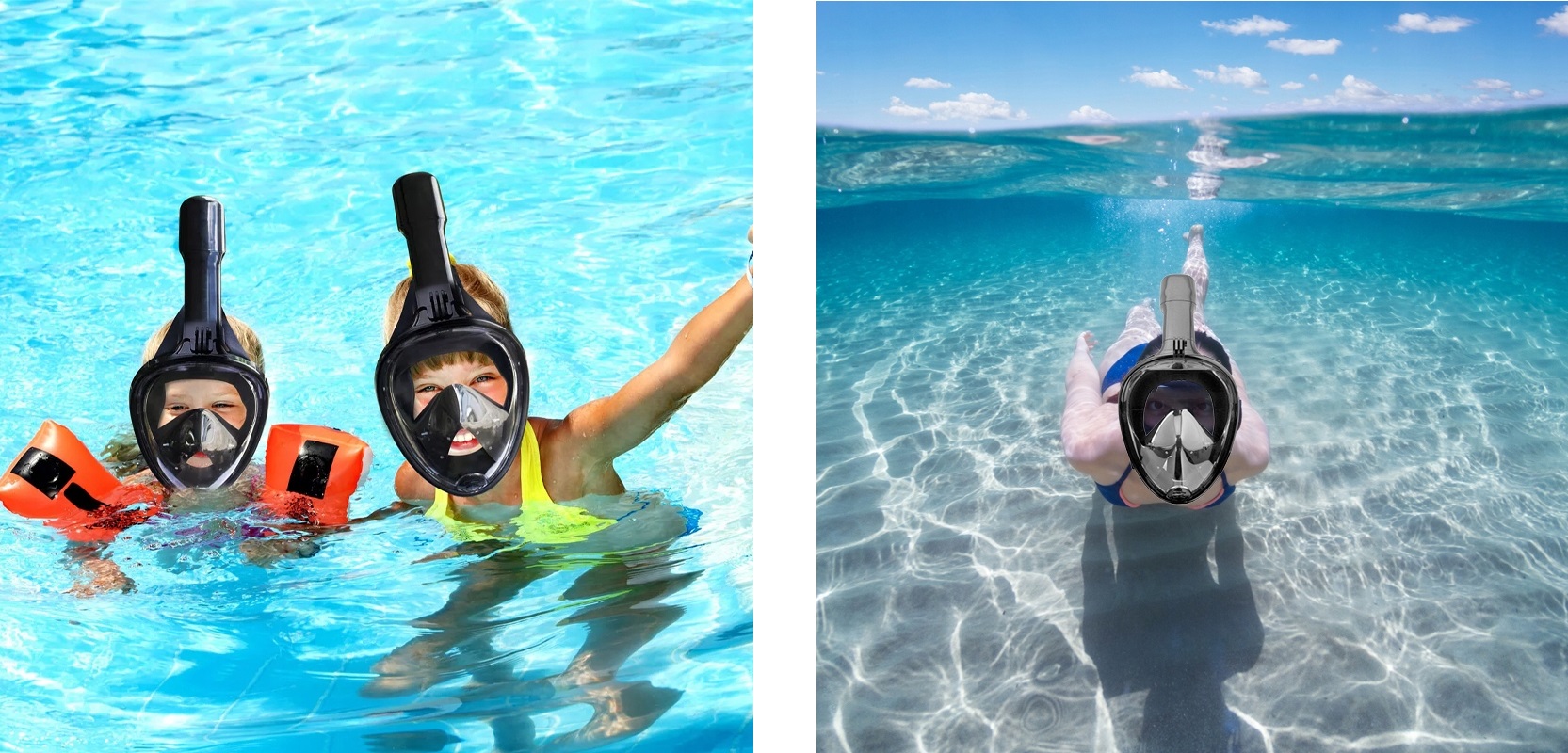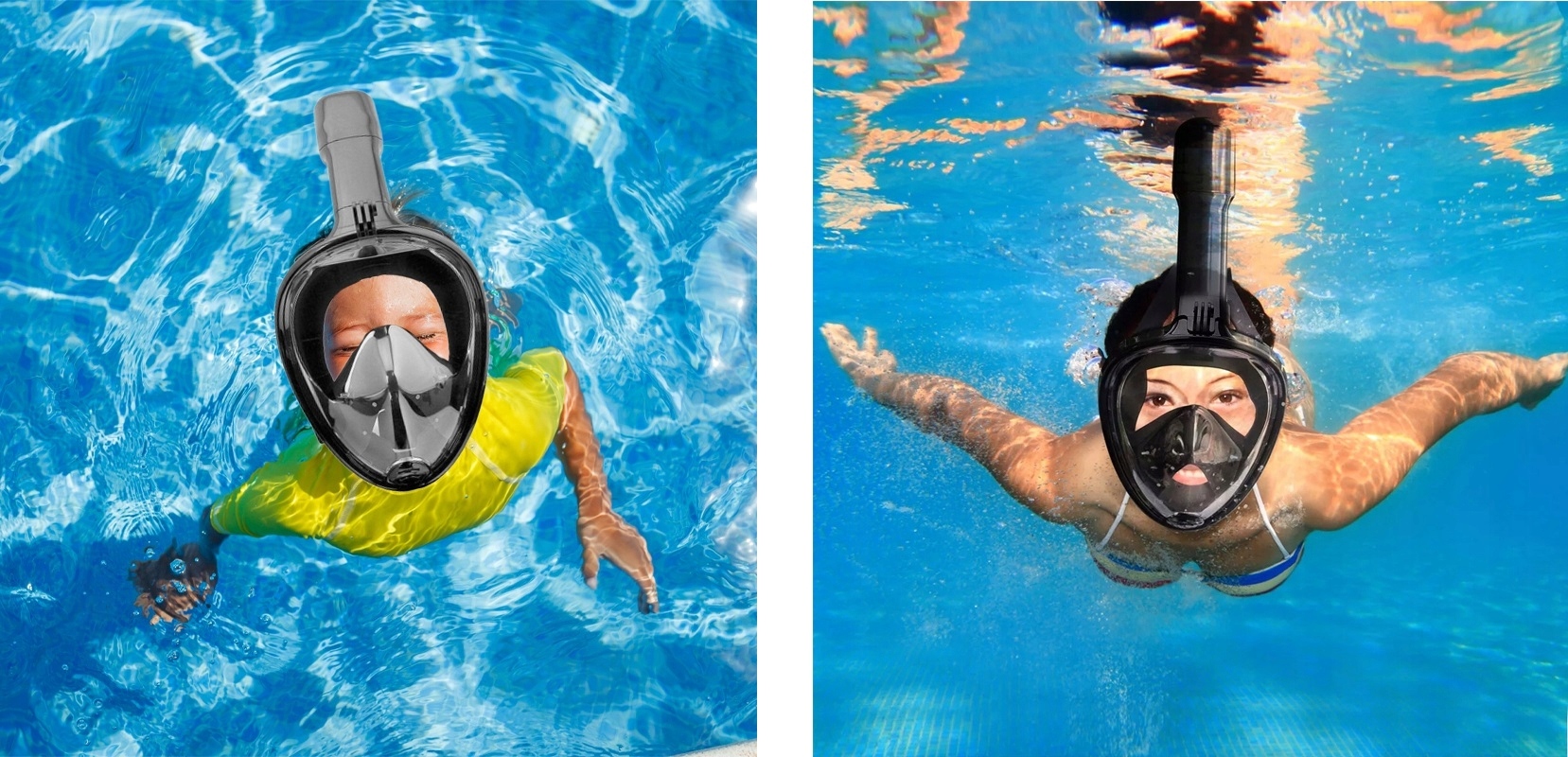 В полнолицевой маске для дайвинга/сноркелинга используется чрезвычайно практичная и современная дыхательная система с двумя трубками! Это облегчит дыхание под водой и продлит время, проведенное в воде.