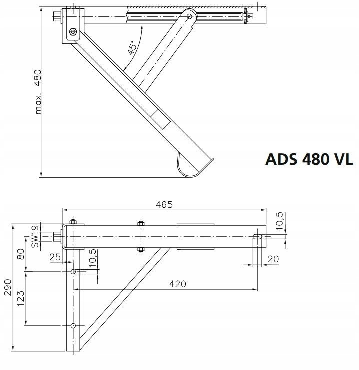 • Складные опоры ADS 480 VR правая сторона b>, Высота 480 мм, Грузоподъемность при использовании 4 шт. под углом 45°: 2000 кг,