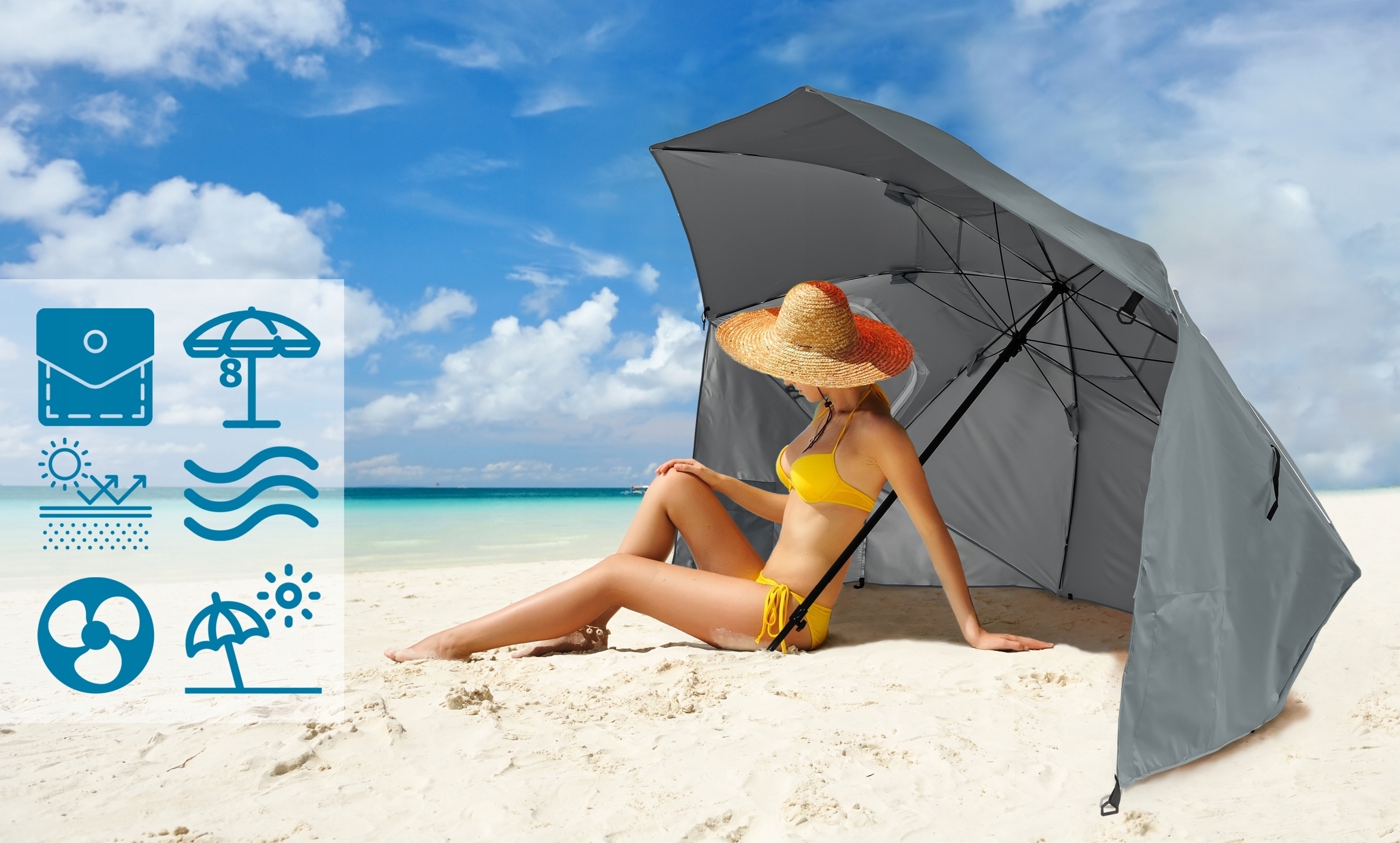 Зонт Sopot Para Sole UPF 50+ заботится о вашем комфорте. Зонт имеет два окна с москитной сеткой и вентиляционными отверстиями, обеспечивающими отличную циркуляцию воздуха. Кроме того, внутренние карманы позволяют хранить напитки, еду и другие мелкие предметы.