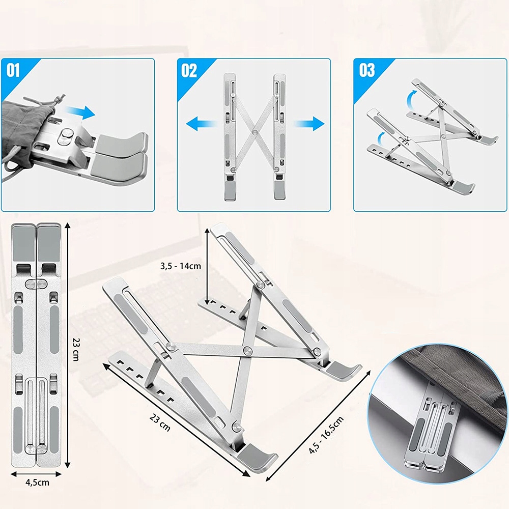 Подставка для ноутбука — изделие, которое идеально подойдет для вашего дома или офиса. Универсальный дизайн делает его совместимым с большинством ноутбуков и планшетов, доступных на рынке. Подставка свободно регулируется, что позволяет использовать ее с устройствами различных размеров и устанавливать их под любым углом. Этот аксессуар значительно улучшает охлаждение электронных устройств, таких как ноутбуки, планшеты и смартфоны, а также его можно использовать в качестве подставки во время чтения книги. В сложенном виде он занимает очень мало места и идеально подходит для путешествий.