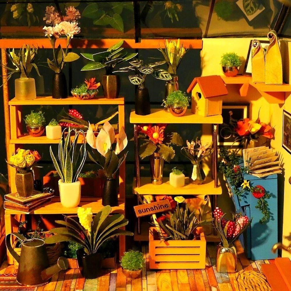 Комплект, позволяющий собрать миниатюрную теплицу со светодиодным освещением. Модель была построена с использованием, среди прочего, дерева, бумаги, ткани, проволоки, пластика и различных декоративных элементов, таких как разноцветные блестки, бусины, искусственные цветы и многие другие материалы. Светодиодное освещение придает всему помещению дополнительный шарм, благодаря чему теплица может служить атмосферным украшением или ночником. Помимо понятной графической инструкции, в упаковке также содержатся батарейки, кисточка, акриловые краски, прозрачный клей без запаха и пинцет для облегчения сборки мелких элементов. Построение этой модели поможет развить навыки ручного труда и доставит массу удовольствия.