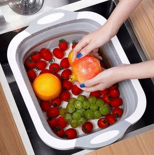 Эта складная кухонная разделочная доска имеет не только разделочную поверхность, но и складную корзину для слива, что делает ее универсальным решением. инструмент для приготовления пищи.