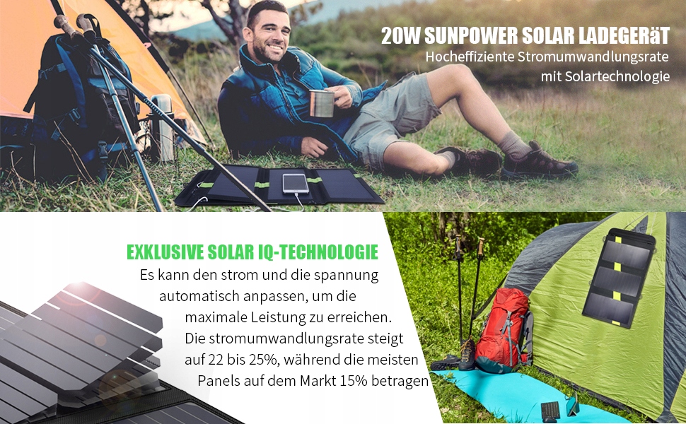 - ▶ Адаптер питания с двумя USB-портами: портативное солнечное зарядное устройство мощностью 20 Вт обеспечивает достаточную мощность для одновременной зарядки телефона и планшета.