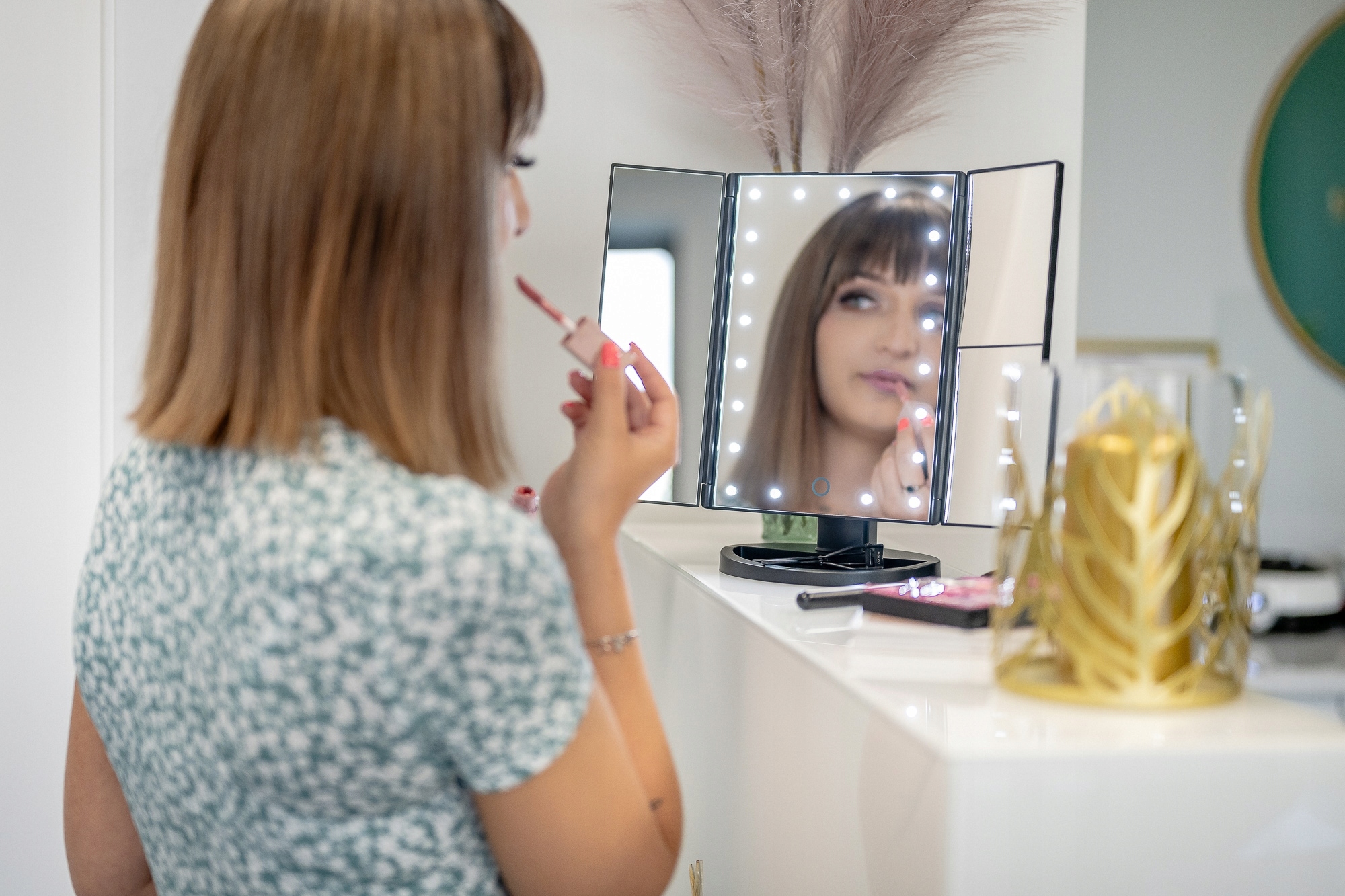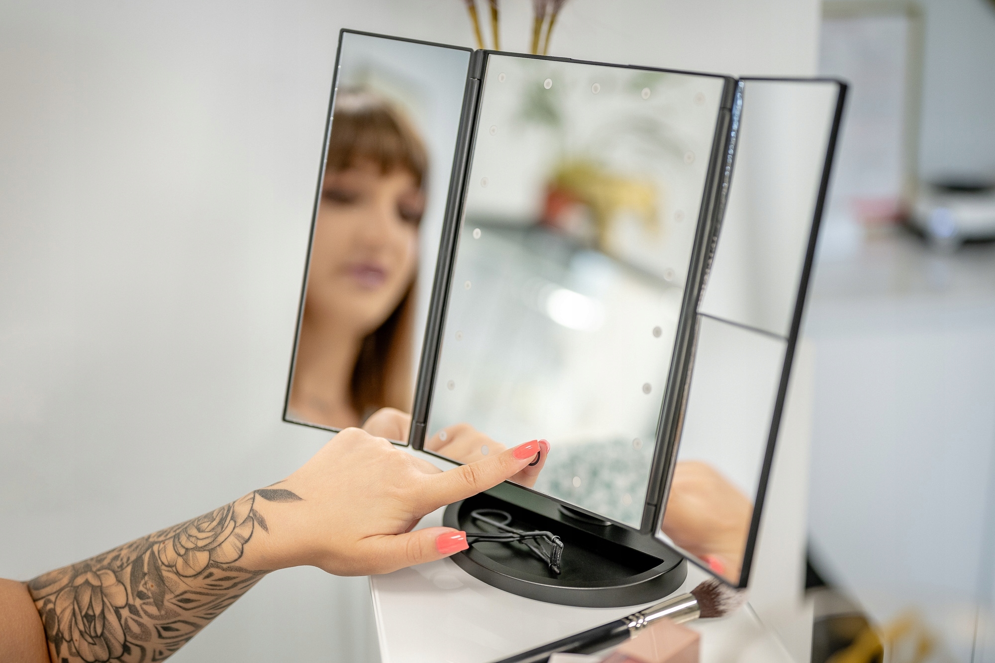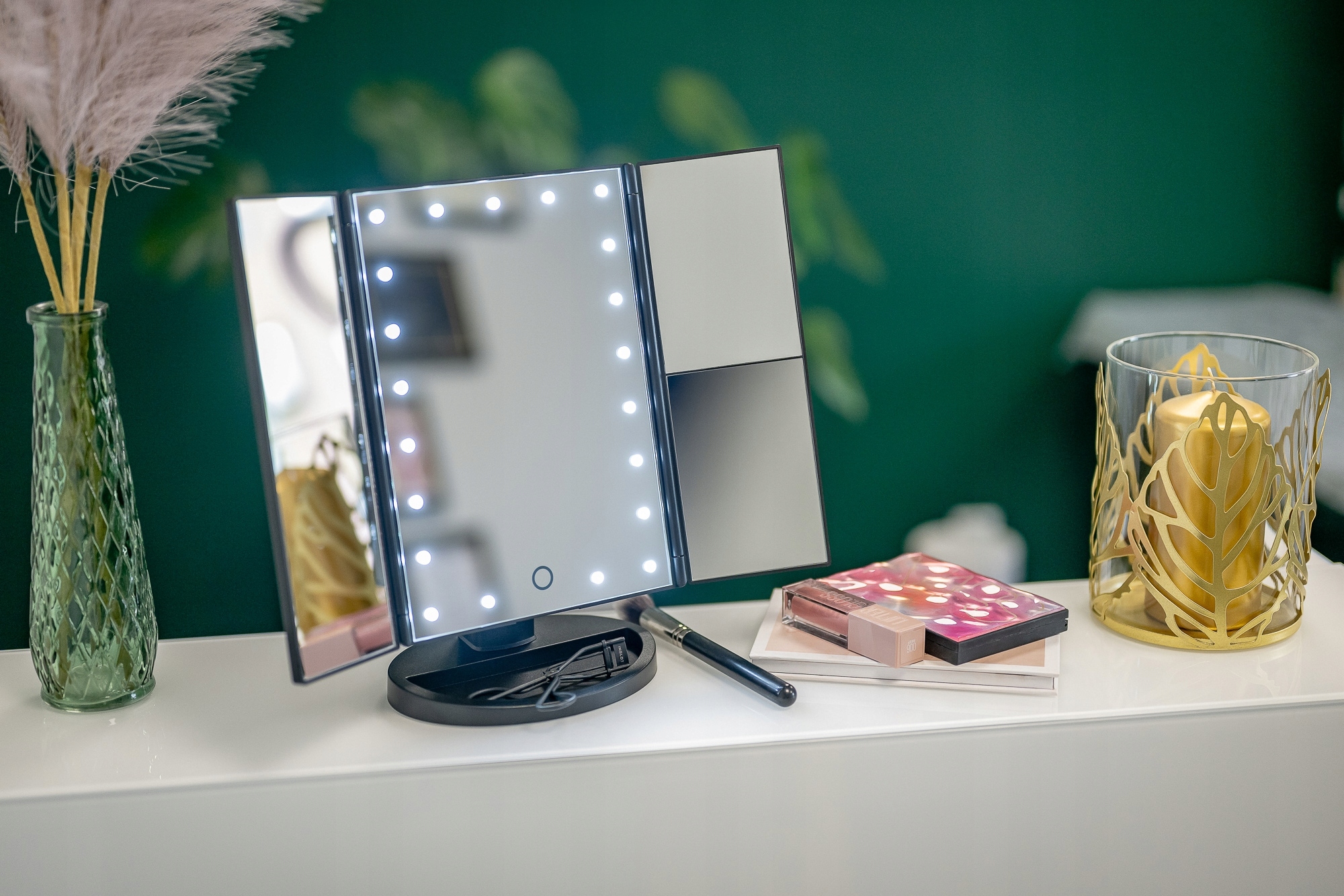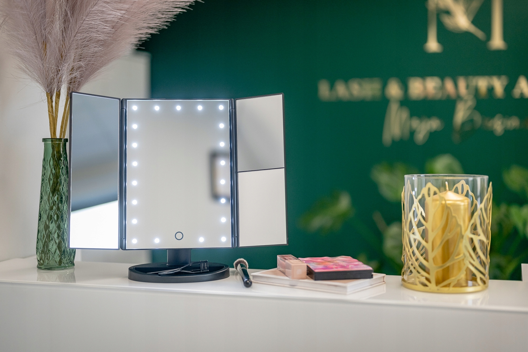 - зеркало для макияжа с подсветкой, оснащенное дополнительными вспомогательными зеркалами.