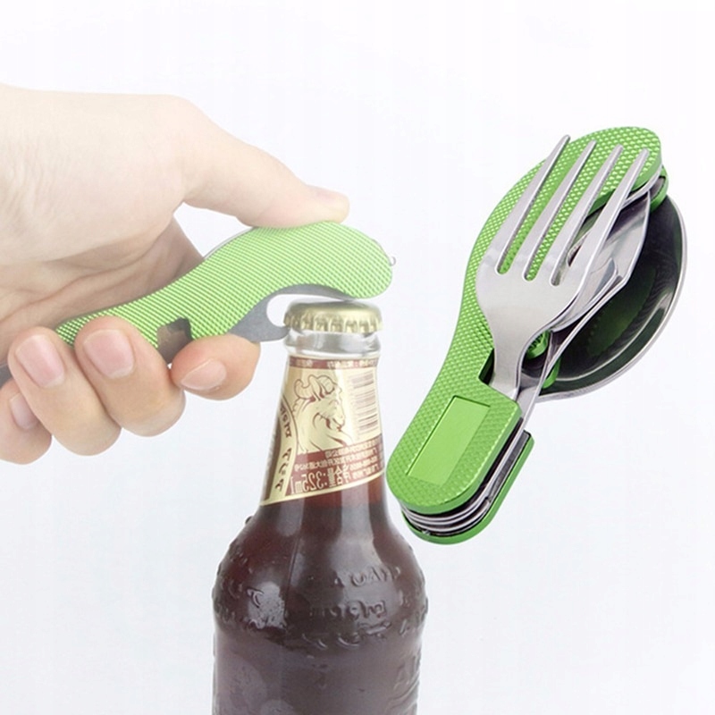 Нож с открывашкой, вилка и ложка объединены в один удобный карманный нож, который всегда можно носить с собой.