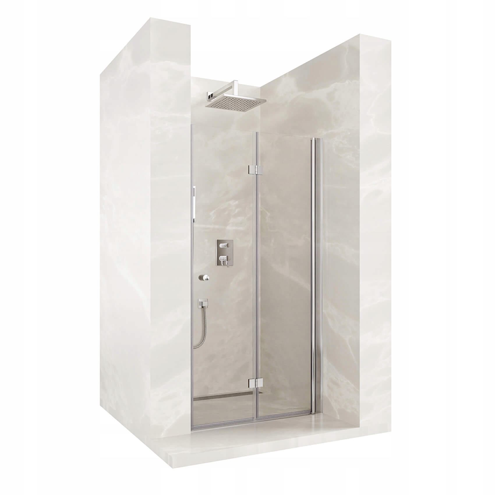 Тема предложения -складывание однолистных углублений. Эта модель дверей душа имеет поворотный профиль. Дверный лист полностью состоит на стене внутрь или за пределами кабины. Следовательно, входной свет в кабину равен ширине двери и никоим образом не ограничен. Благодаря возможности сложить дверь к стене, вы можете лучше использовать пространство в ванной. Это особенно полезная функция в небольших ванных комнатах.
