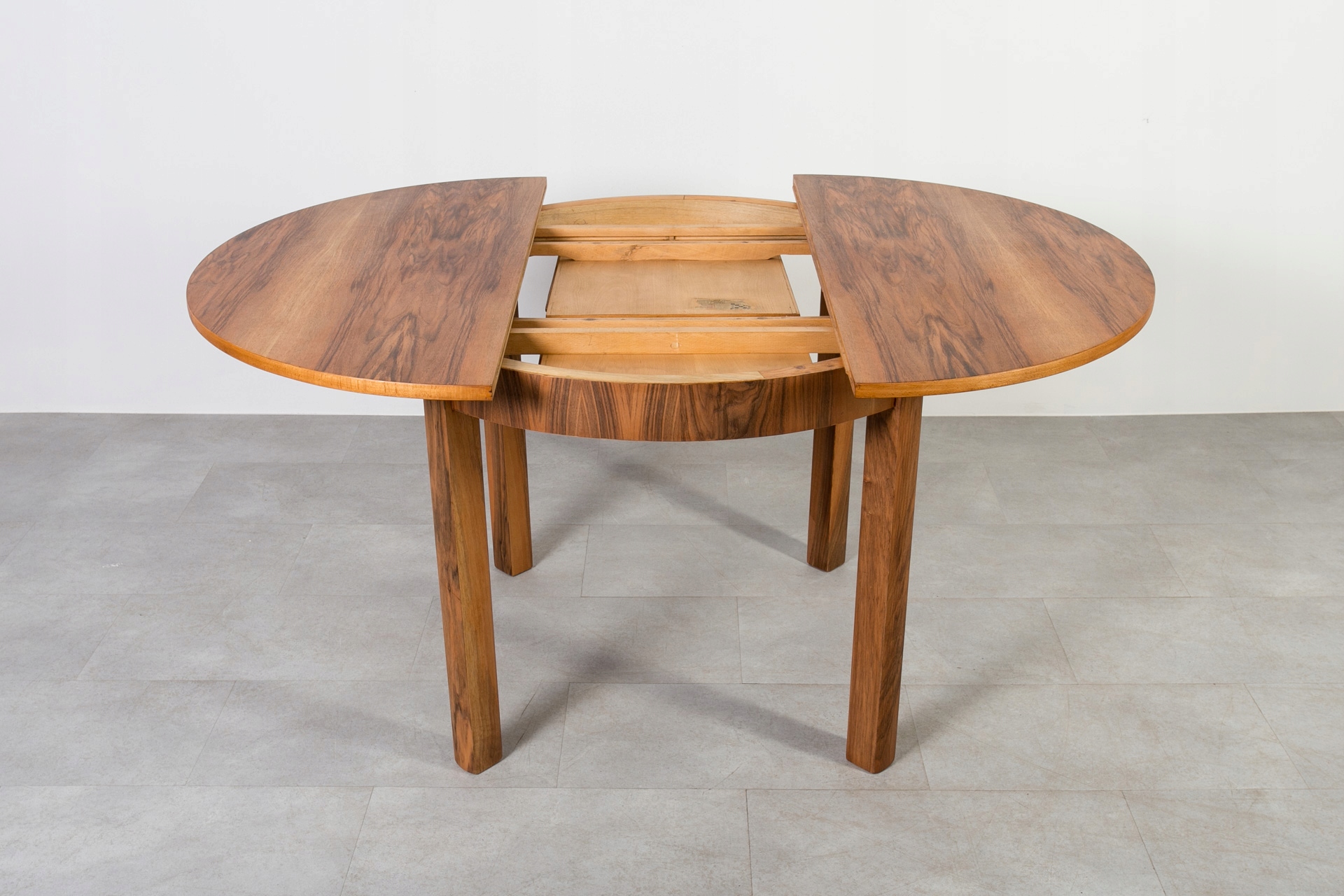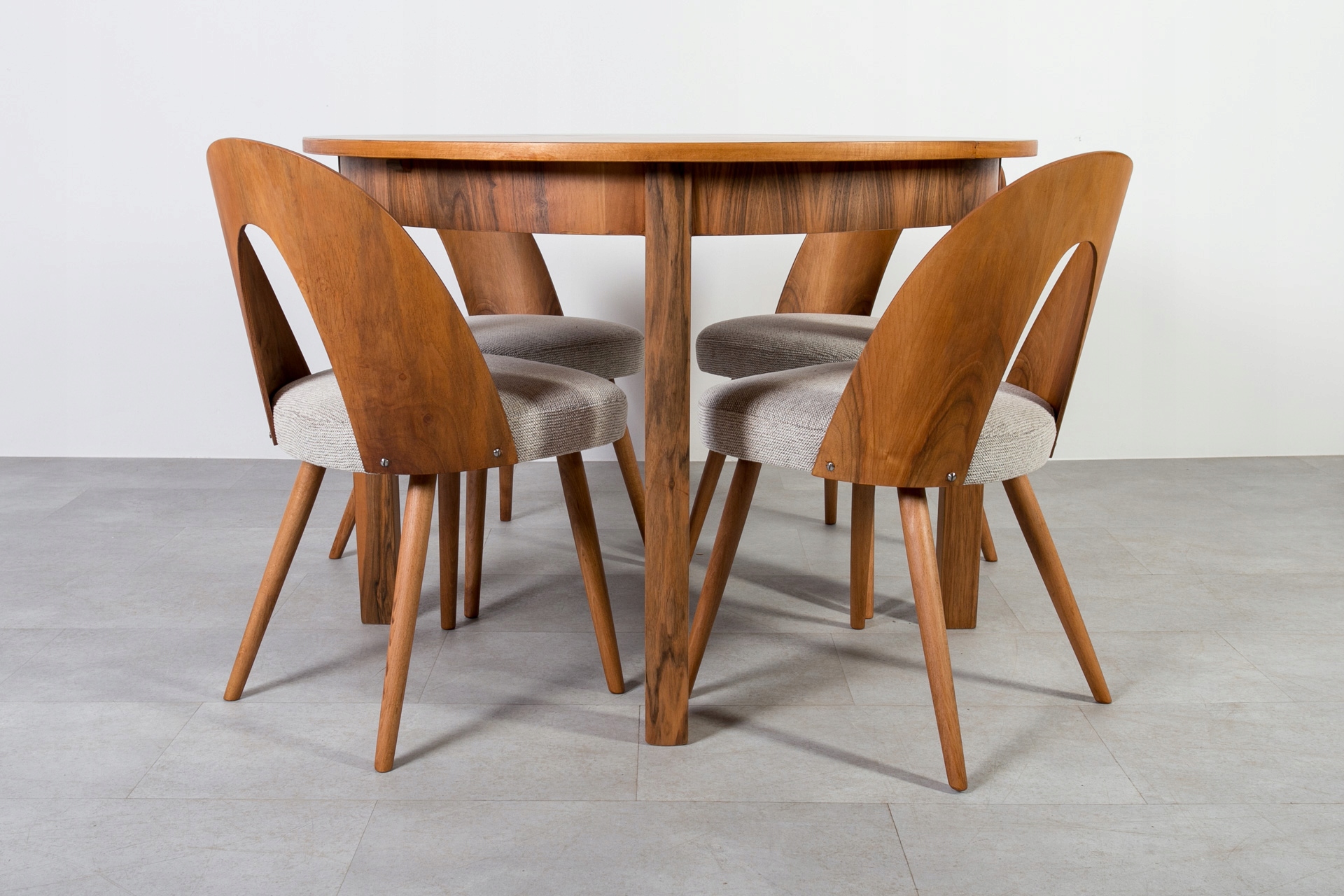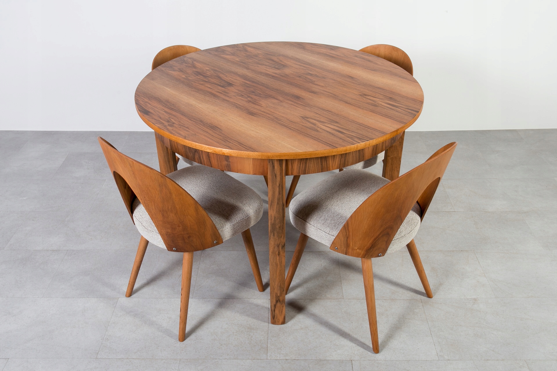 Этот уникальный обеденный набор состоит из элегантного, круглого, складного стола и четырех оригинальных винтажных стульев, разработанных Антонином Шуманом. Это прекрасный пример лучшего чешского дизайна 1960 -х годов, оцененный за вечную элегантность и функциональность. Весь набор был тщательно восстановлен, с оригинальным персонажем и очарованием винтажа. Деревянные поверхности были очищены и отделаны маслом, что не только защищает древесину, но и дает ему гладкую и естественную отделку. Все четыре стула были переоборудованы с элегантной бежевой тканью. Эргономичный дизайн стульев выдающимся Антонином Шуманой обеспечивает исключительный комфорт сидения. Следует помнить, что, хотя набор был тщательно восстановлен, это оригинальная винтажная мебель и может носить небольшие следы патины или использование - это не новые предметы.