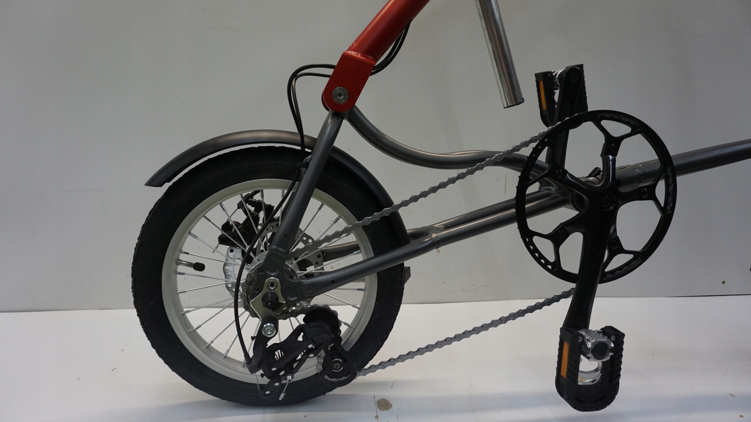 Просто потянув коленчатый вал вверх, велосипед можно разложить пополам, позволяя ему катиться на колесах.