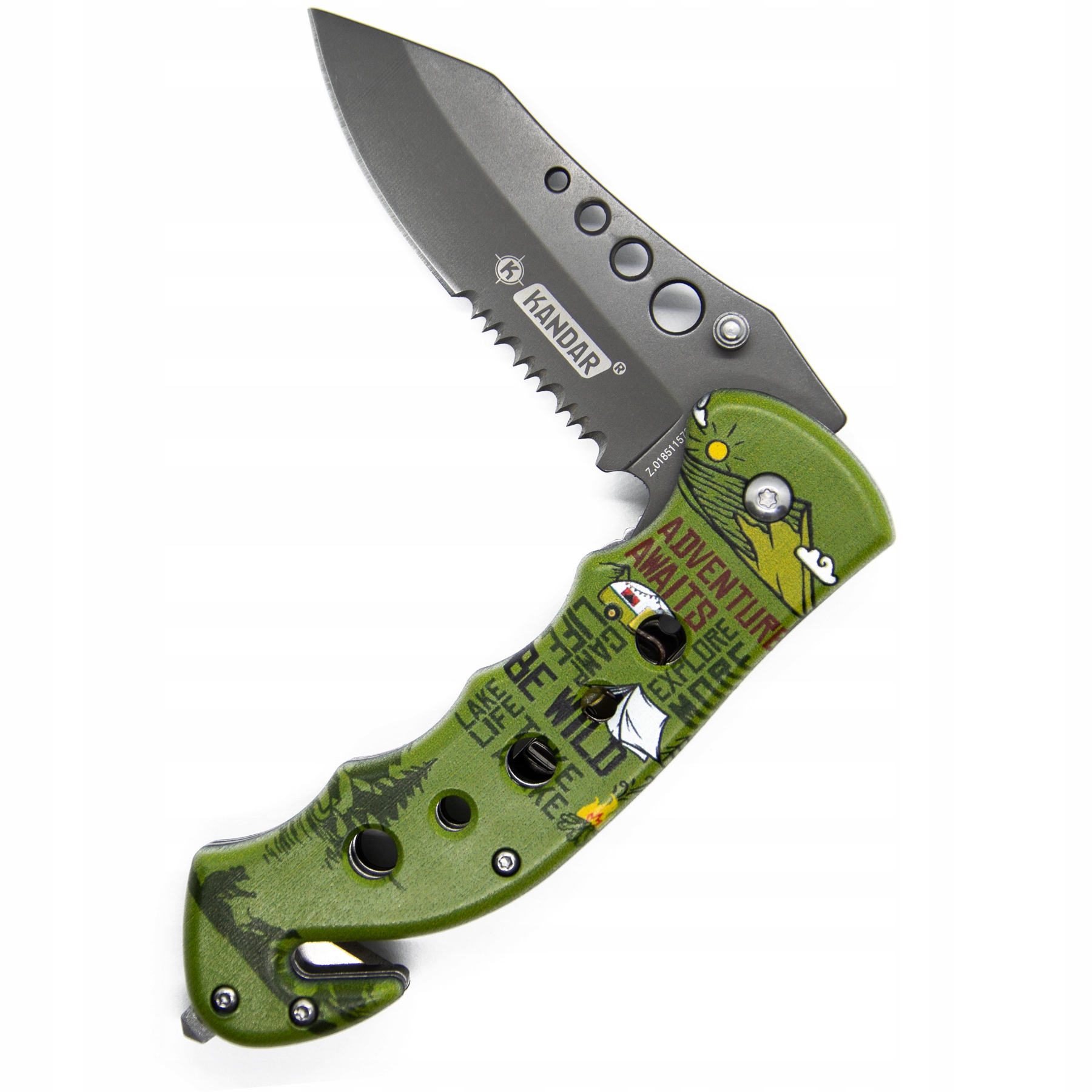 Лезвие складного туристического ножа Kandar Adventure Awaits имеет зазубренный пилообразный элемент и специальные отверстия, влияющие на эргономику резки. На тыльной стороне рукоятки имеется специальная резак для ремней и веревок. ., а при транспортировке ножа клипса незаменима, так как позволяет удобно прикрепить изделие к карману брюк, системе крепления MOLLE или брючному ремню.