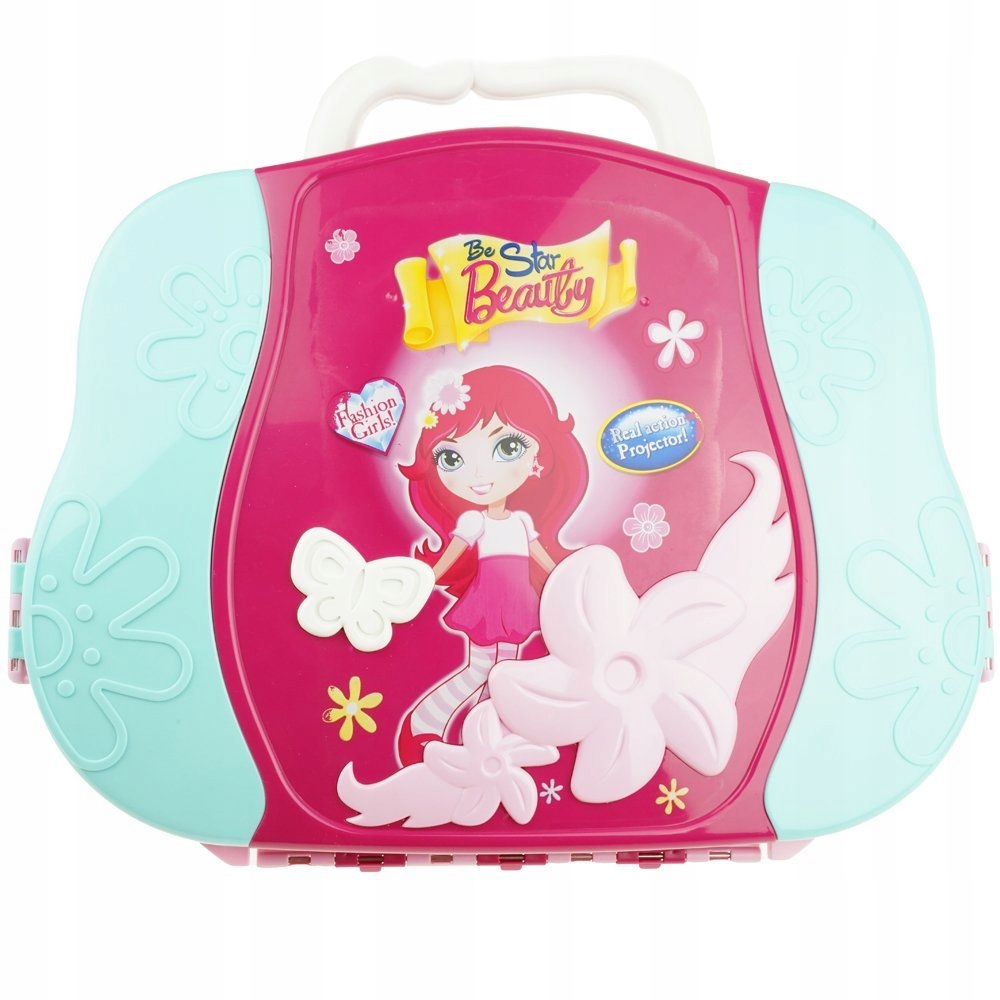 Фантастический набор для маленькой принцессы, которая любит готовиться, создать красивые прически. Все аксессуары были размещены в прохладном чемодане , который при развертывании является своего рода парикмахерским-косметическим положением. В таблице есть проектор , на котором вы можете отображать фотографии косметики, частей тела и кукол. Туалет имеет большое зеркало, боковое помещение для косметики, в нем также есть аксессуары.