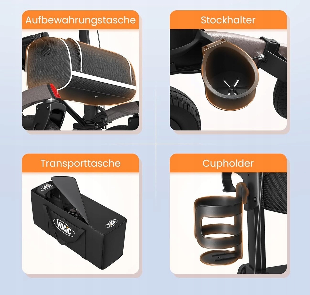 Алюминиевый ходок. Vocic Model, оснащенная складывающим сиденьем, легким алюминиевым рамкой и самостоятельными колесами. Устойчив к различным поверхностям, удобно использовать.