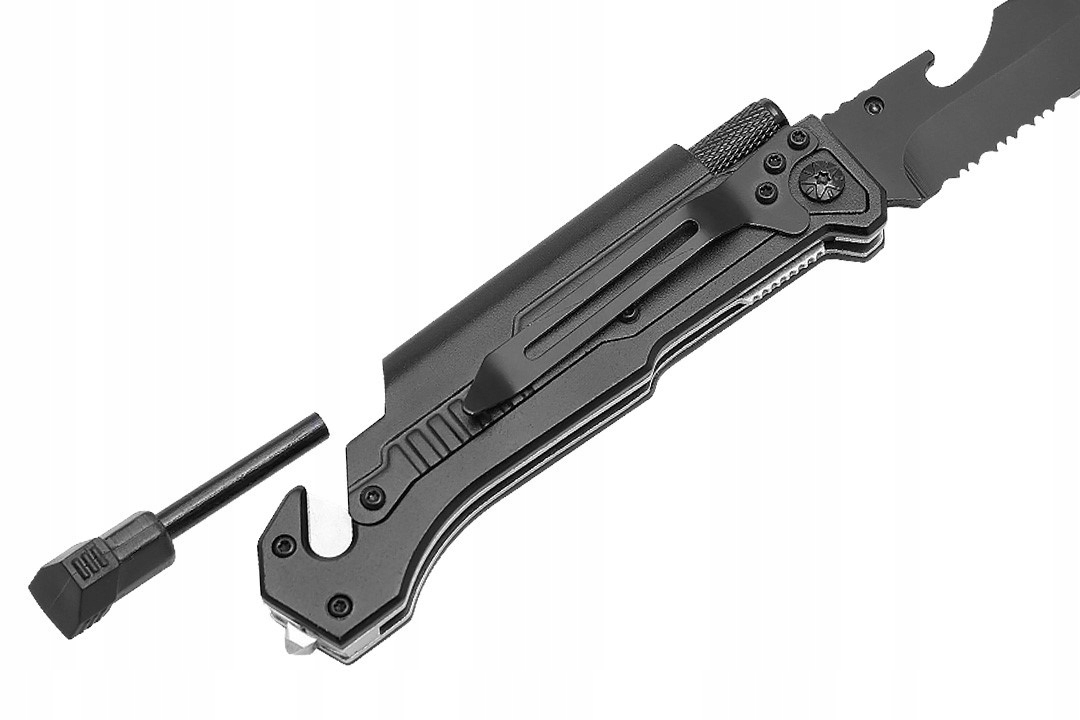 Спасательный нож всегда должен быть под рукой, поэтому он оснащен металлический зажим, чтобы можно было прикрепить его к ремню или инвентарь.