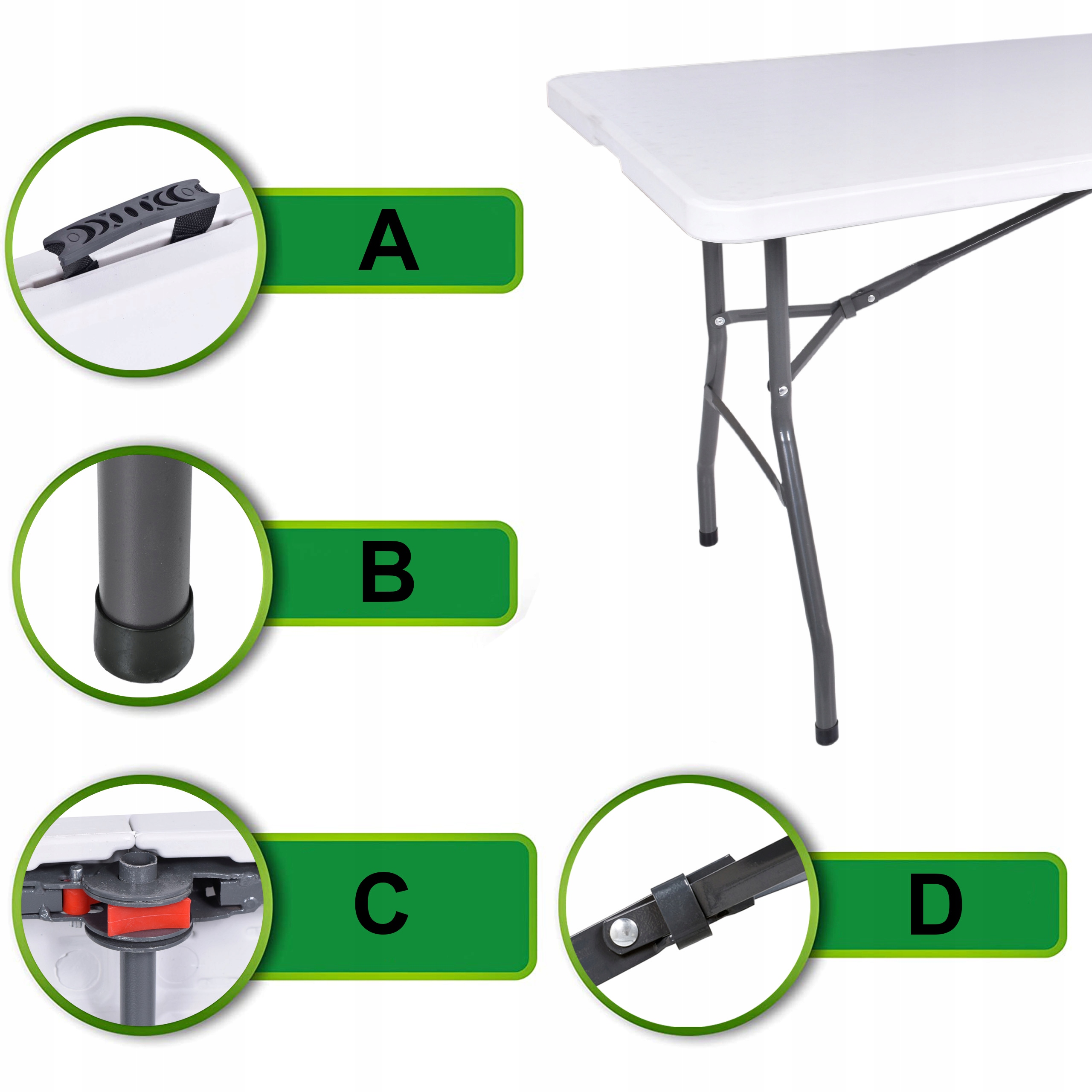 Складной стол для кемпинга и общественного питания. Очень практичный и легкий. Конструкция из стали. Столешница изготовлена из прочного пластика. В сложенном виде стол образует практичный чемодан, поэтому занимает мало места и его легко транспортировать. За столом могут разместиться до 12 человек.