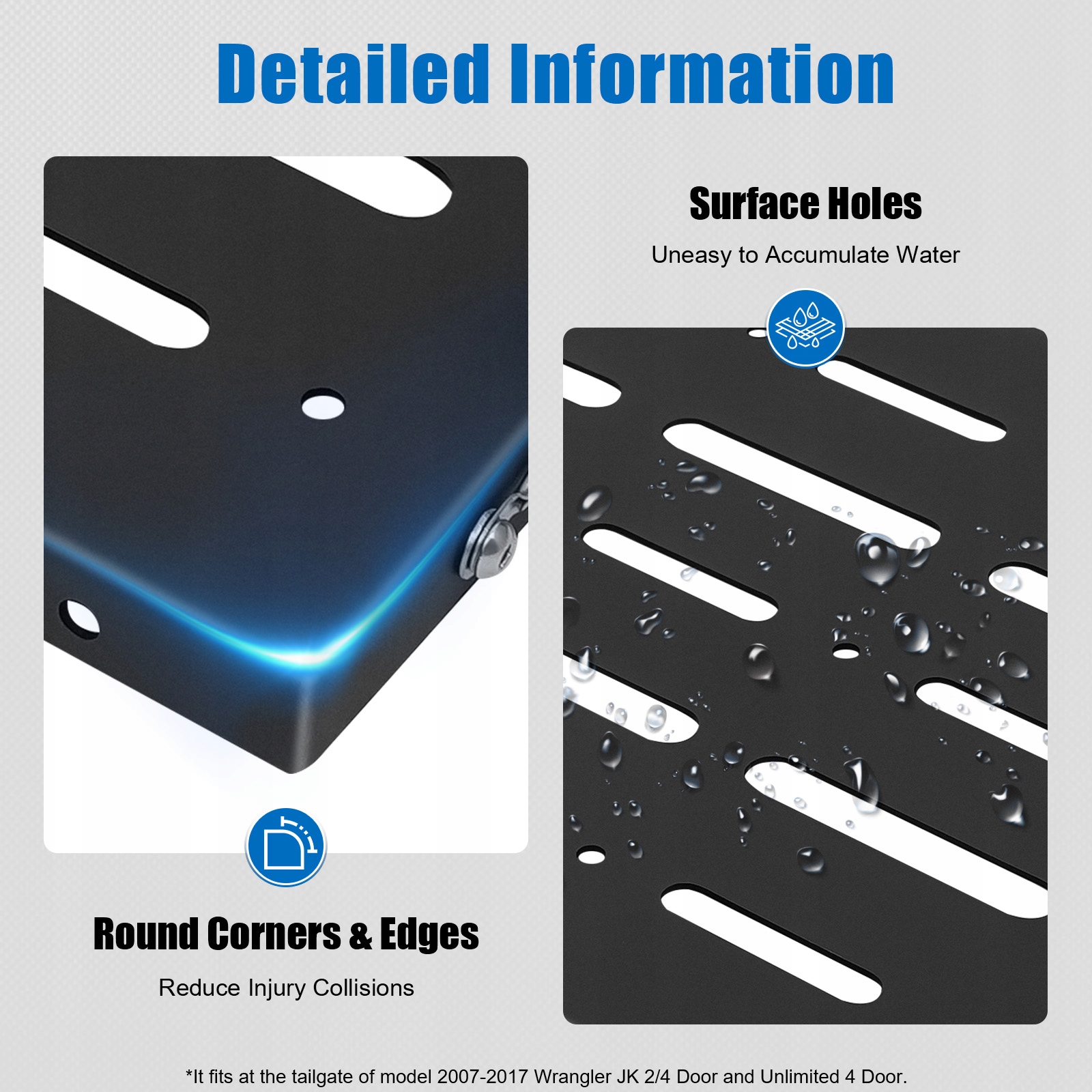 Поверхностные отверстия: на поверхности продукта есть много отверстий, чтобы вода не накапливалась в нем, и ее продлитель Жизнь применяется к модели: Do Wrangler JK 2/4 Дверь 2007-2017 гг. И не ограничен 4 дверца