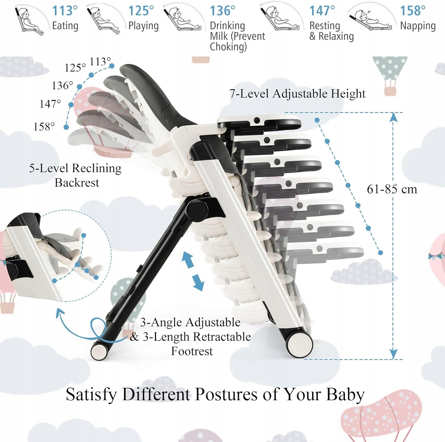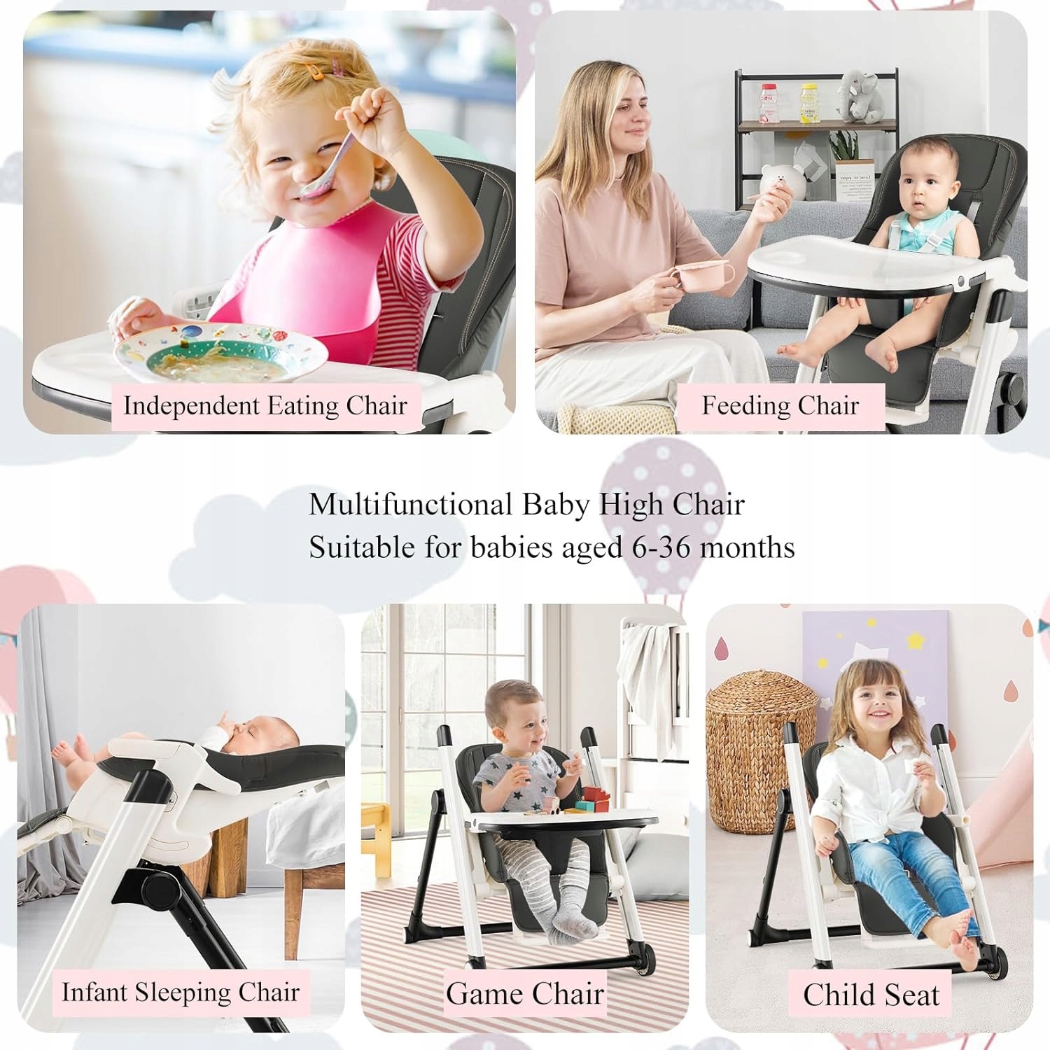Высокий стул выполняет функцию и доступен в удобном месте. Мебель с высотой, потому что высота сиденья и подвода ног можно легко отрегулировать на высоту стола. Регулируемый поднос, который облегчает позиционирование во время еды, и нижний лоток, используемый в качестве игровой поверхности. После еды спинка может быть установлен в удобных положениях для Испании. Стул с высокой столовой также можно хранить в игровом кресле или на обычном детском сиденье. Удаление использования верхнего лотка с помощью PP, которое можно промыть в посудомоечной машине, и съемные подушки из ПВХ с помощью PU, что облегчает чистку. 4 Заблокировать с помощью аварийного переключателя