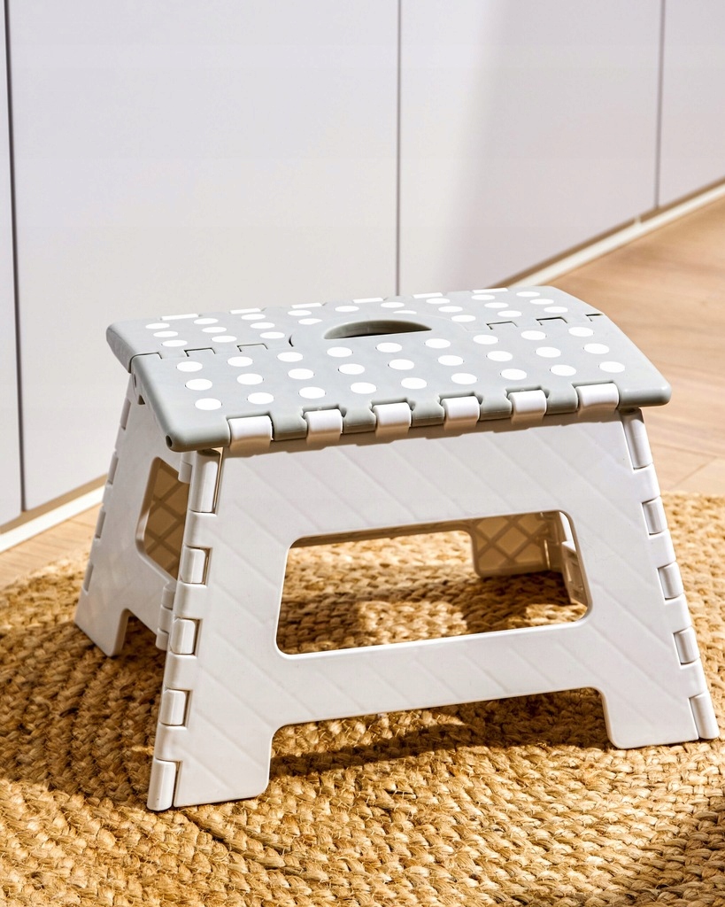 В сложенном виде табурет занимает мало места благодаря складному механизму. Его легко переносить и хранить. Он оснащен ручкой, позволяющей перемещать его в любое место.