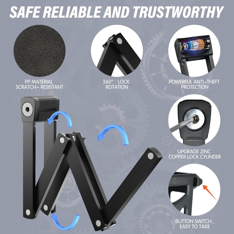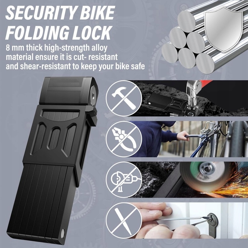 Надежность и защита от кражи: Складной велосипедный замок — полностью закрытый замок, изготовленный из высокопрочной легированной стали толщиной 8 мм, устойчивый к гидравлическому сдвигу и порезам. Для соединений использовались заклепки из нержавеющей стали. Соединения чувствительны, имеют высокую прочность на растяжение, устойчивы к подрыву и предотвращают повреждение от силы, а также выдерживают высокий крутящий момент. Высокое качество и прочность на разрыв