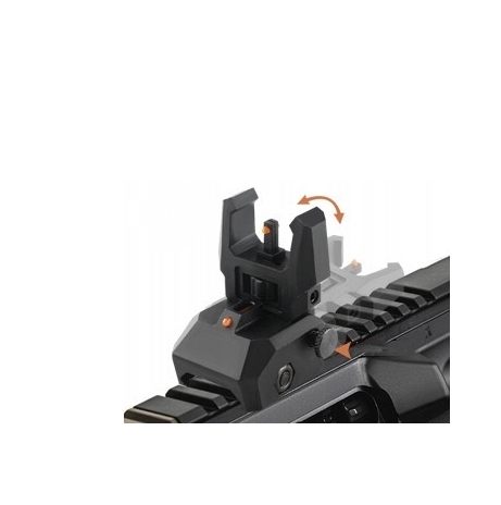 Подпружиненная кнопка для большого пальца позволяет быстро разворачивать или убирать прицел. Функция пружинного открывания активируется путем потягивания задней крышки.