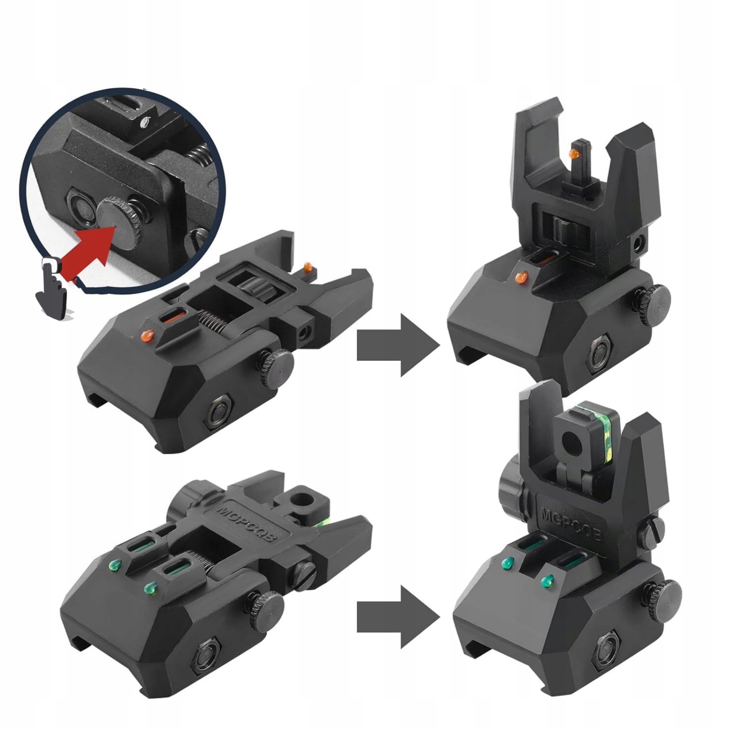 Легкое переворачивание: Выдвижной пружинный механизм для большого пальца. Легко открывается пружинной кнопкой. Быстро развертывайте и корректируйте по мере необходимости. Подпружиненные передний и задний складные прицельные приспособления можно легко активировать, потянув назад заднюю крышку.