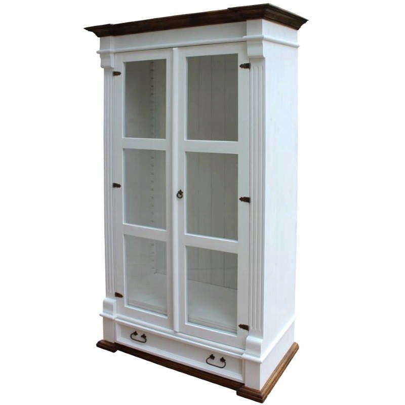Стеклянная витрина полностью изготовлена из массива сосны. Благодаря сочетанию классического деревенского стиля с современными цветами мебель становится одновременно очень современной.