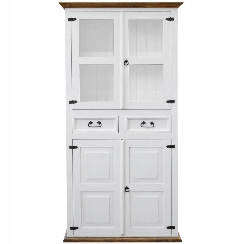 Стеклянная витрина полностью изготовлена из массива сосны. Благодаря сочетанию классического деревенского стиля с современными цветами мебель становится одновременно очень современной.