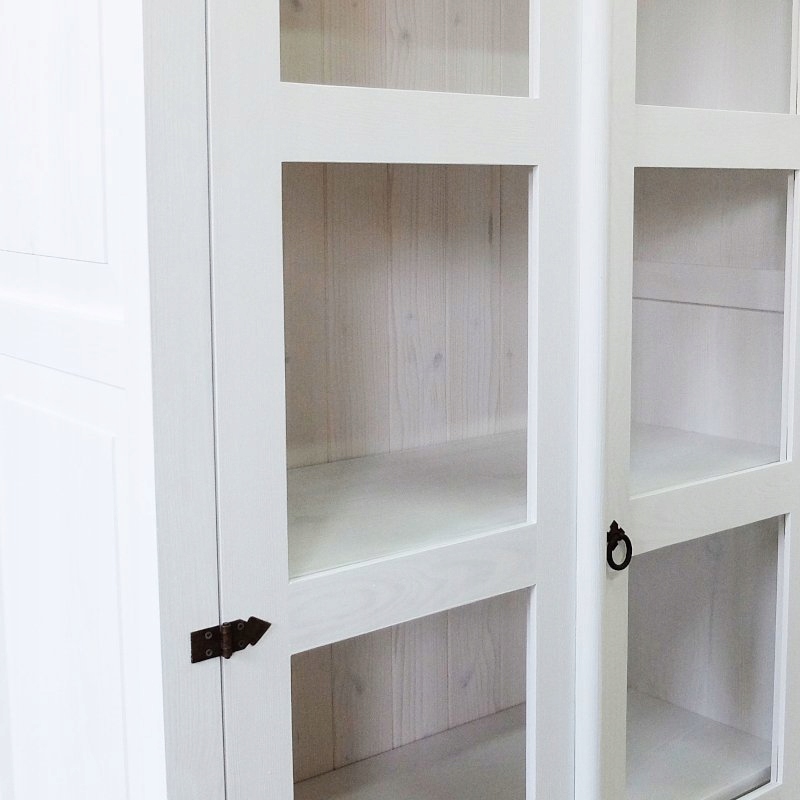 Стеклянная витрина полностью изготовлена измассива сосны. Благодаря сочетанию классического деревенского стиля с современными цветами мебель становится одновременно очень современной.