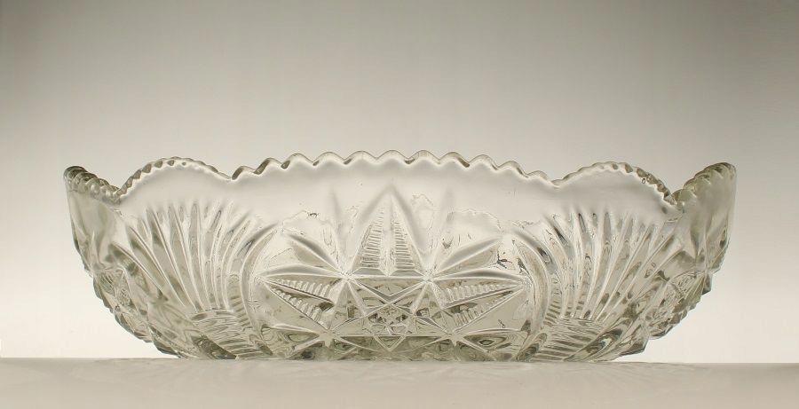 Jardiniera изготовлено из бесцветного прессованного стекла. Произведено на Хозяйственном стекольном заводе «Гортензия» в Петркуве-Трыбунальском. 1970-е годы
