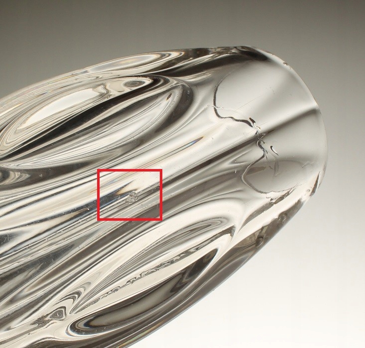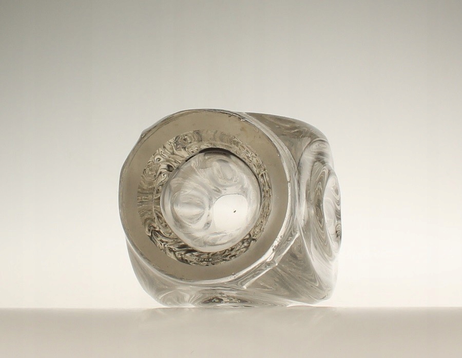 Внутри нет осадка. Край заливной горловины и край основания ровные, без сколов и шероховатостей. По краю заливной горловины и снаружи днища имеются мелкие служебные царапины на различных фрагментах рельефных деталей. В нескольких местах имеются небольшие неровности по вертикальным краям и микроповреждения около 3 мм на одном из них. Стеклянная масса не белоснежная.