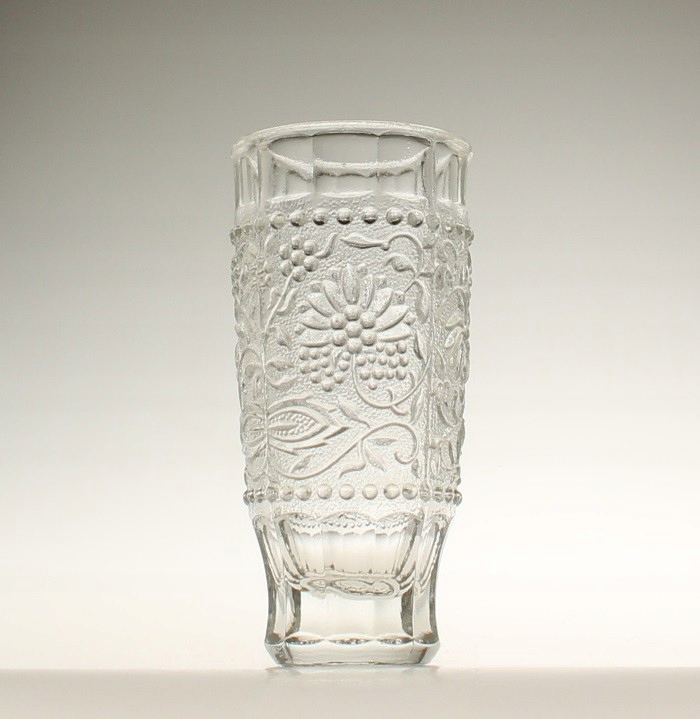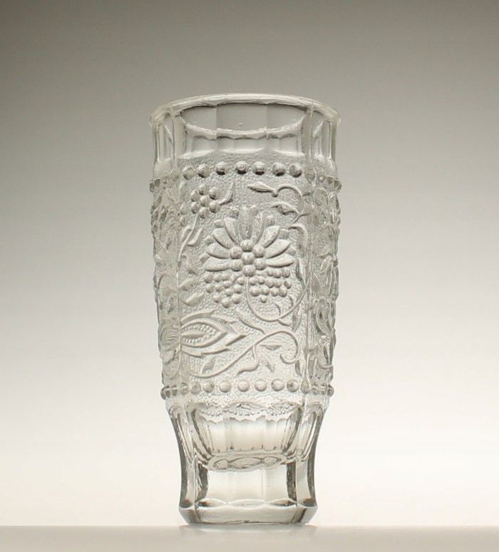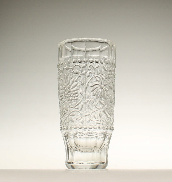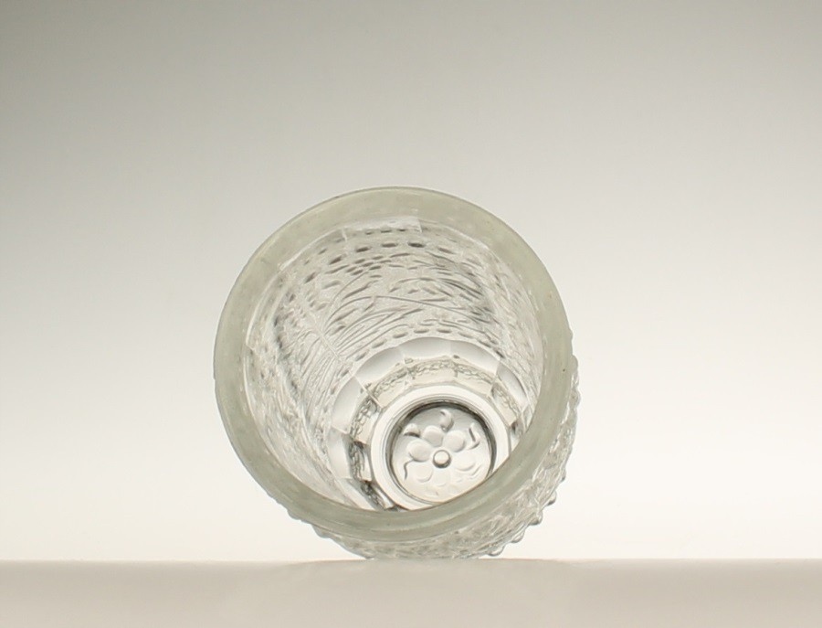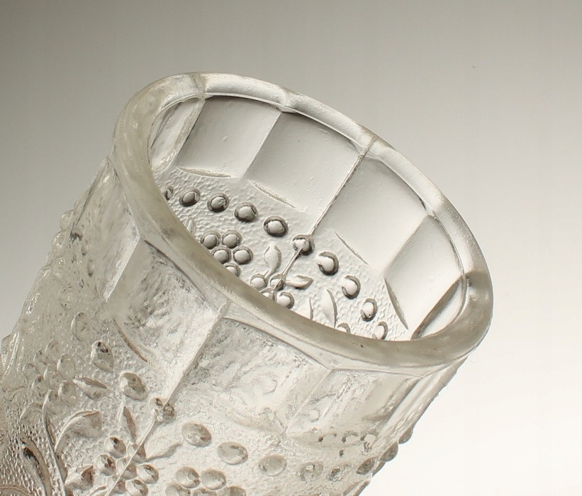 Ваза из бесцветного прессованного стекла. Живот украшен тиснением с луковым узором. Судно спроектировал Павел Панек для стекольного завода «Рудольфова хата». Серия «Цибулак». Чехословакия, 1970-е годы.