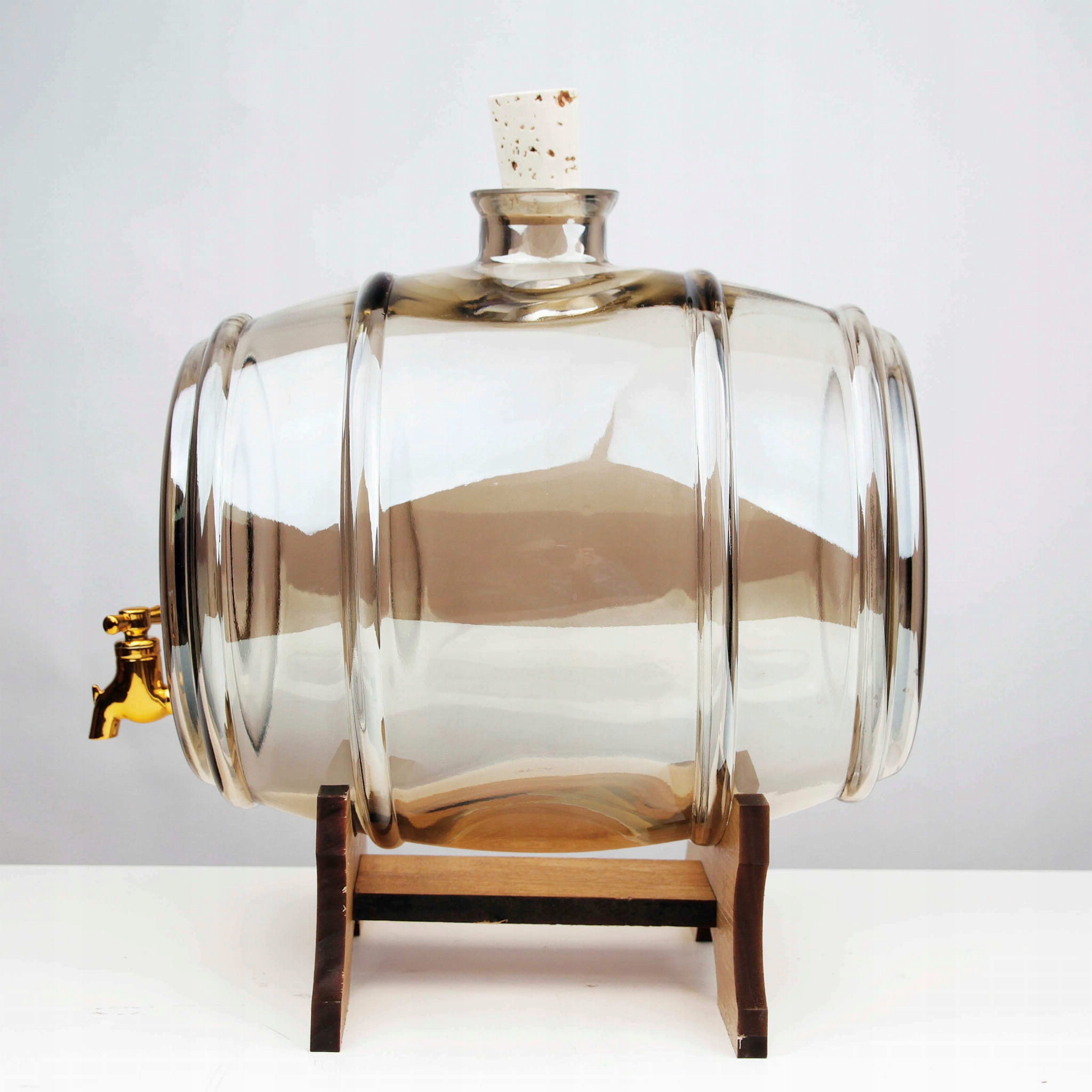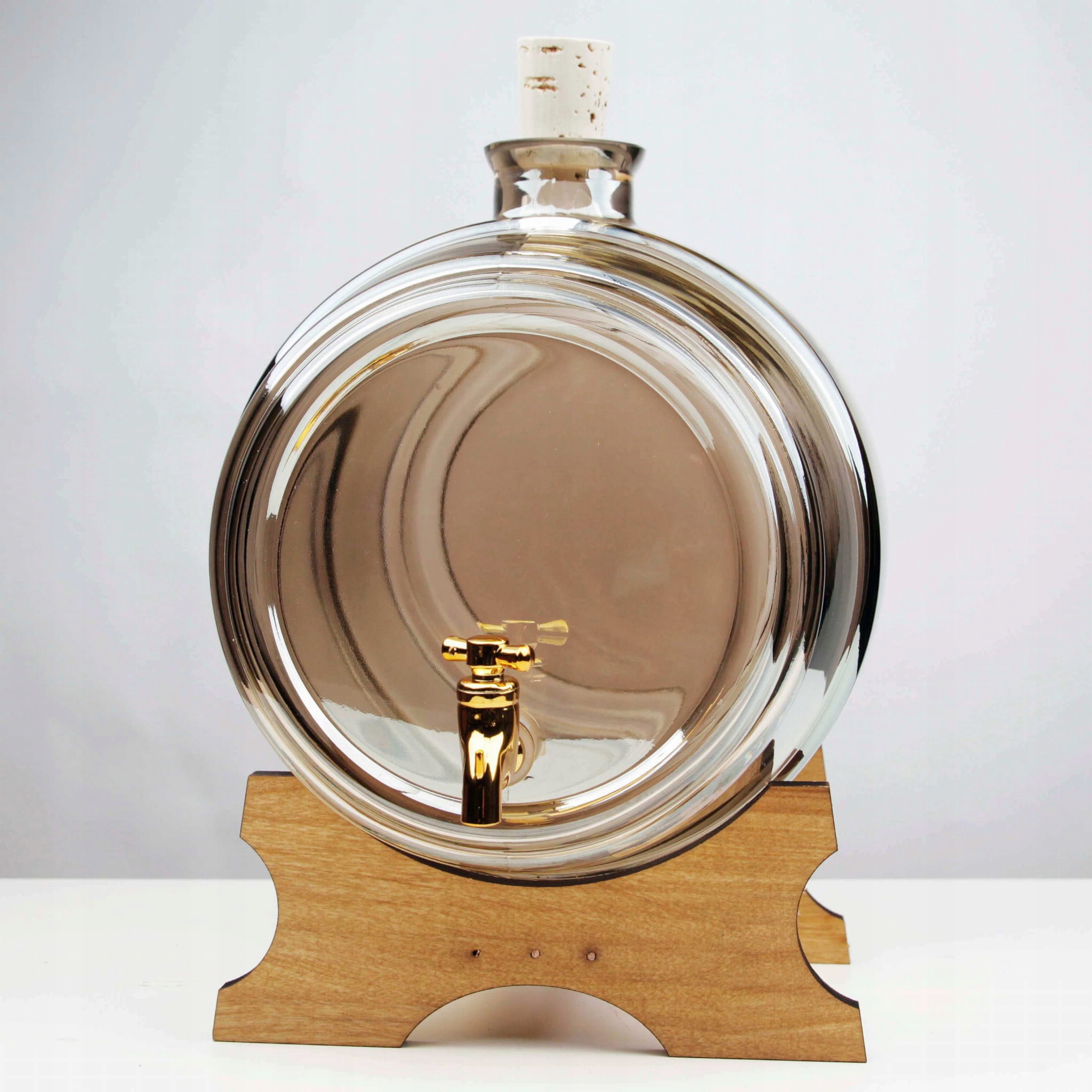 Стеклянная бочка 1 л станет отличным дополнением к декору вечеринки. Прекрасно будет смотреться на свадебном и юбилейном столе. Также рекомендуем его для проведения корпоративных мероприятий и в составе постоянного оборудования клубов, ресторанов и баров. В представленной модели стекло тонировано в элегантный пепельный оттенок, придающий напитку еще более благородный вид. В комплект помимо литрового бочонка входит пластиковый или латунный кран, деревянная подставка и пробка.