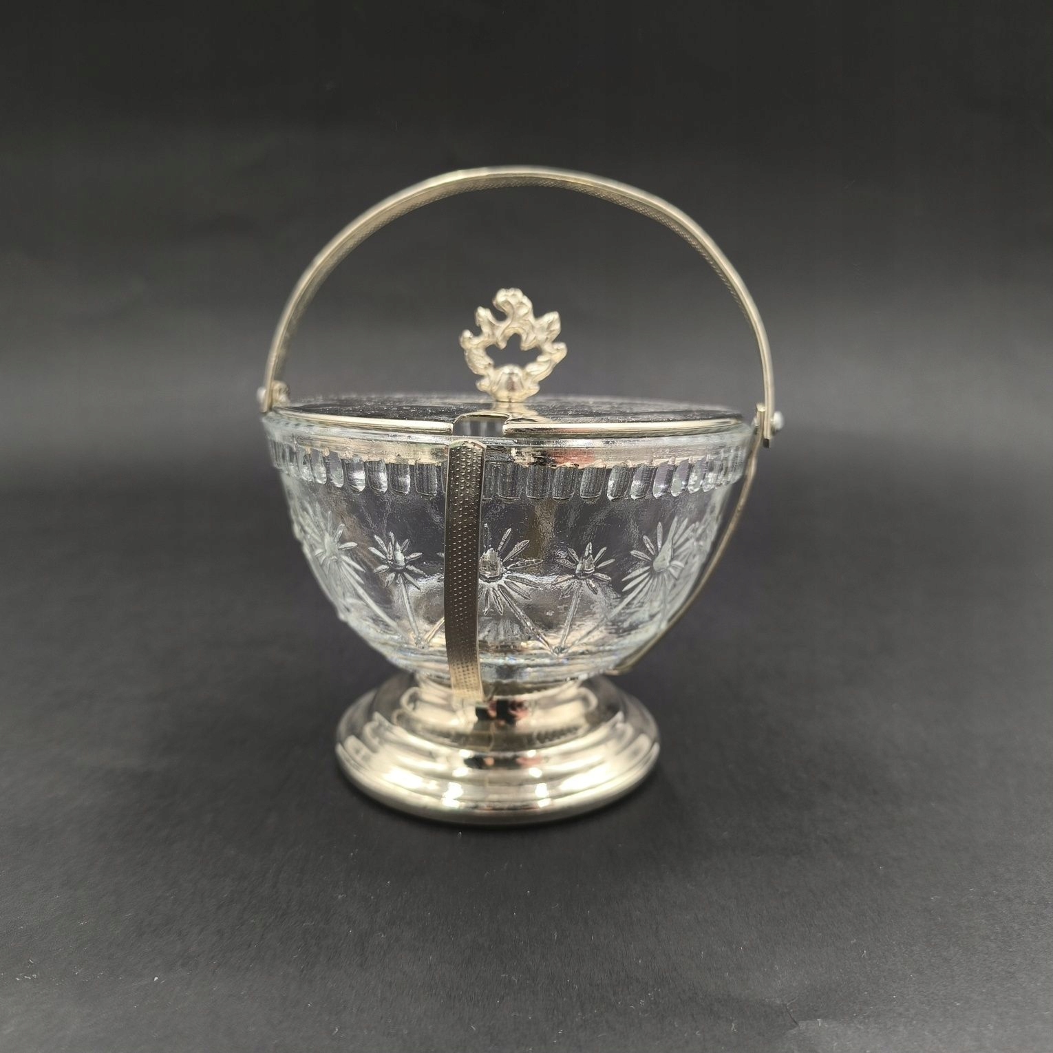Элегантная сахарница из прессованного стекла, заключенная в декоративную рамку. Украшен геометрическим и цветочным мотивом, оснащен ручкой и крышкой с декоративным элементом. Практичная и привлекательная вещь в стиле ретро, которую можно использовать как практичную вещь, так и в качестве коллекционного или декоративного предмета.