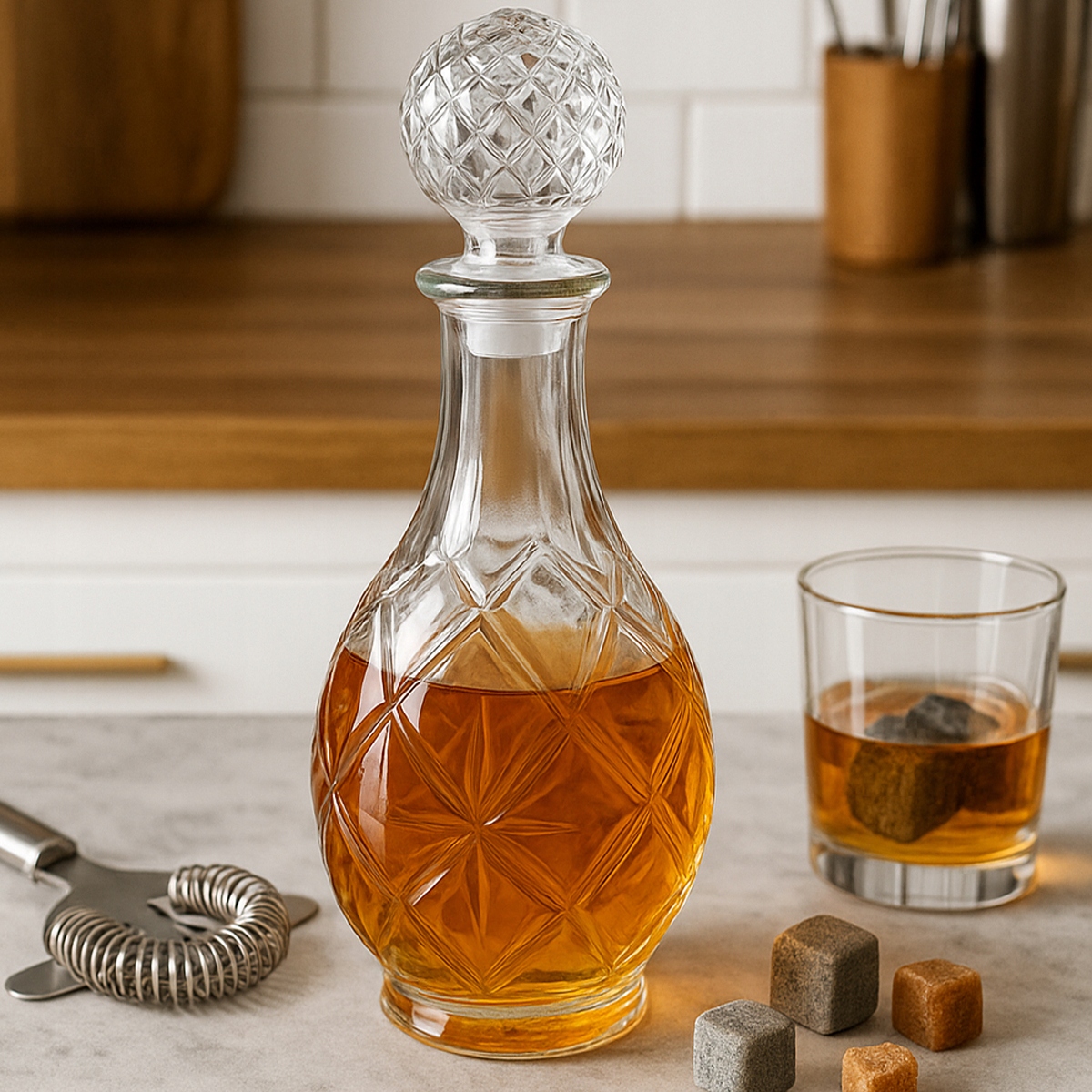 Плотная крышка в виде декоративной пробки защищает содержимое от окисления и потери аромата, дольше сохраняя напиток свежим. Благодаря своим компактным размерам графин легко поместится в любой шкаф или бар, а уникальный дизайн делает его таким же привлекательным, как и полноразмерные декоративные сосуды.