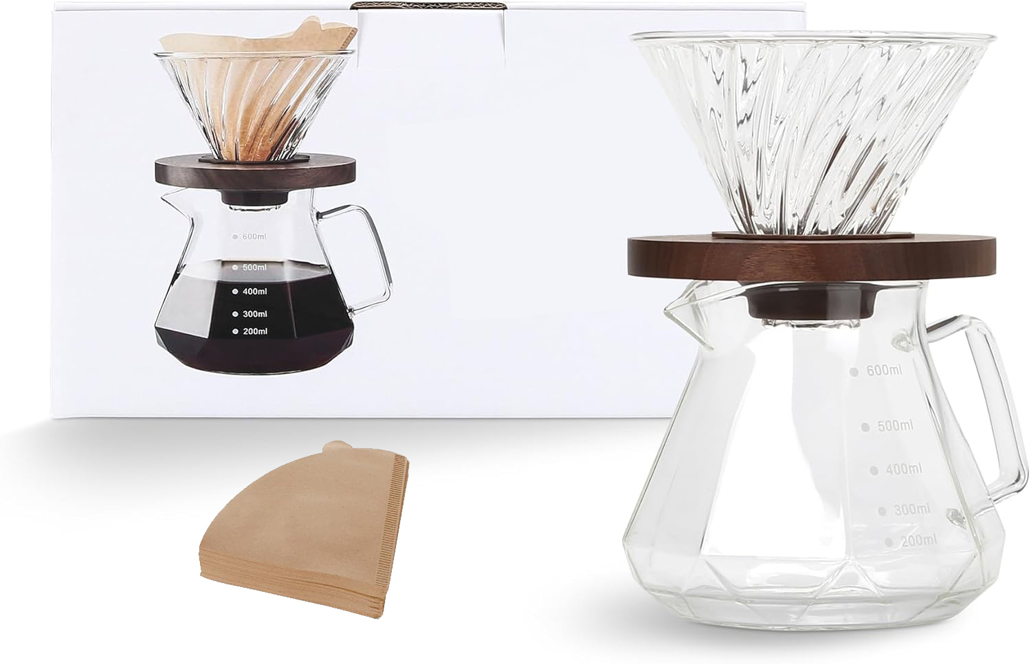 Набор кофейников для перелива, 600 мл, боросиликатное стекло, 2 бумажных фильтра, 100 листьев, ручки из ореха, для дома, кафе, ресторана и кемпинга, 20 унций, от 1 до 3 чашек