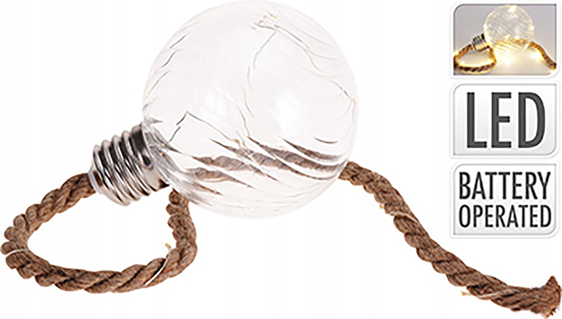 Светящееся рождественское стеклянное украшение для елки, а также как самостоятельное украшение. Оснащен прочной джутовой веревкой, которая используется для подвешивания, а также является красивым декоративным элементом. Благодаря светодиодным лампам внутри он озарит ваш отпуск теплым светом.