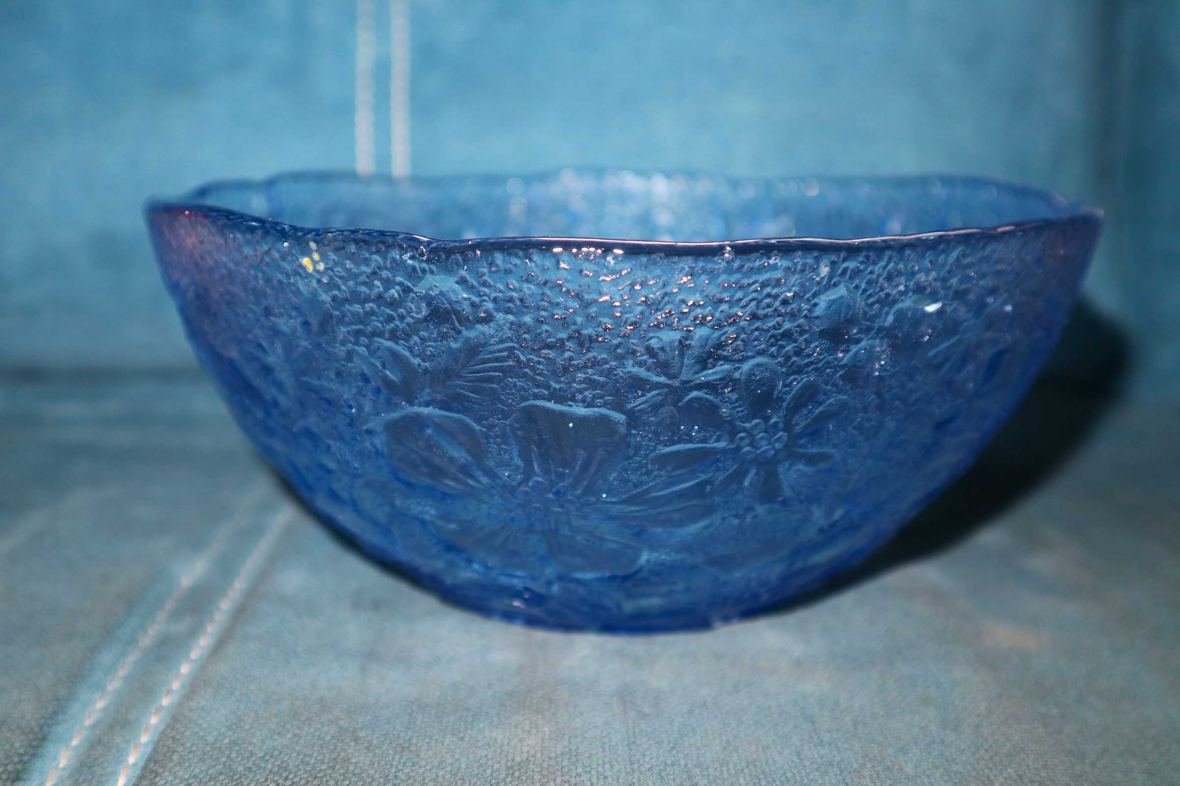 Красивая стеклянная миска из синего стекла с цветочным мотивом, высота 9 см, среда 21 см