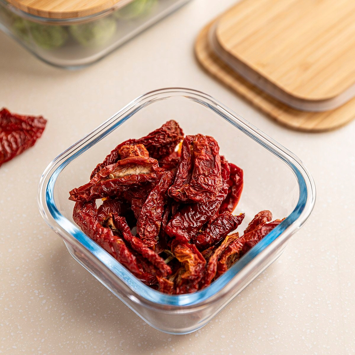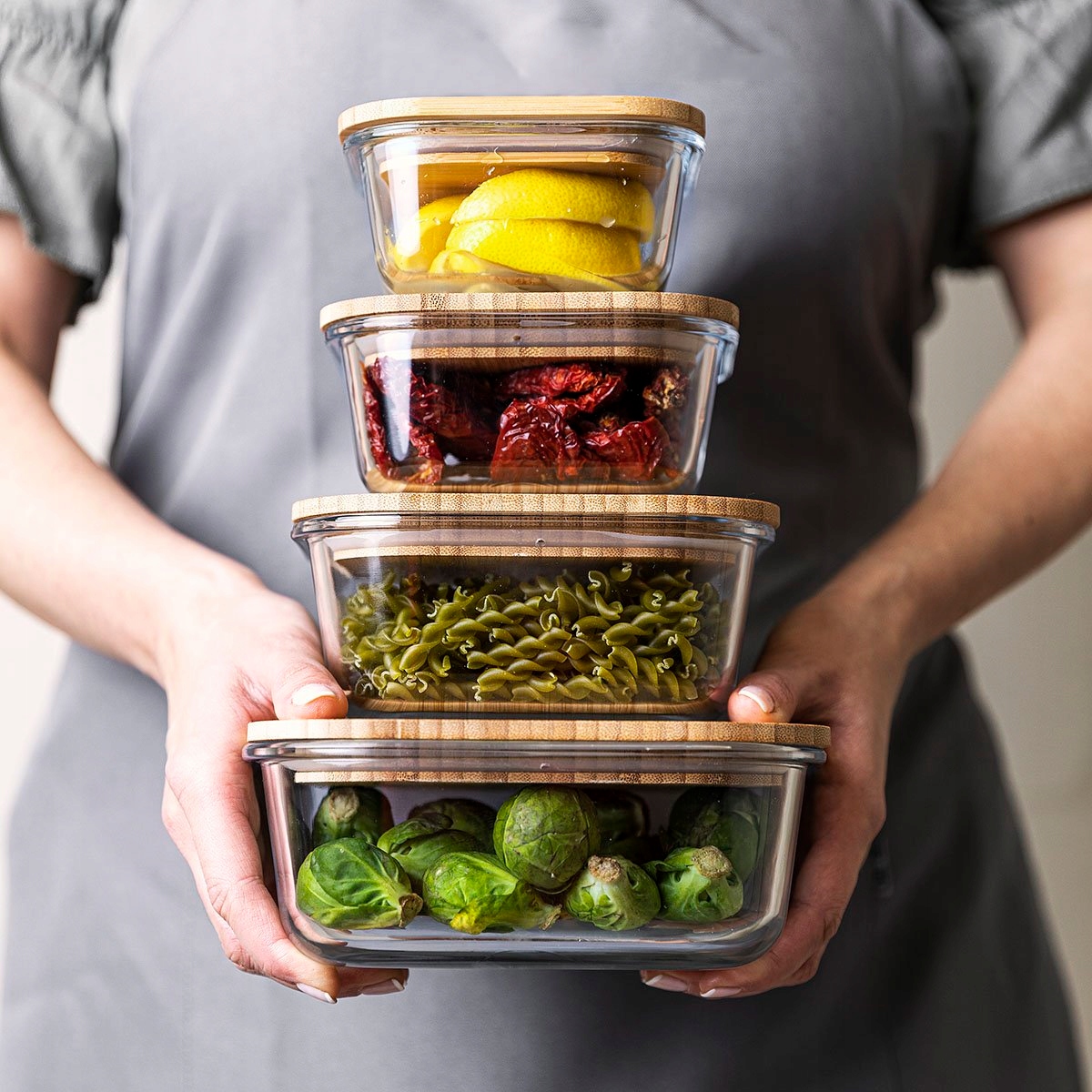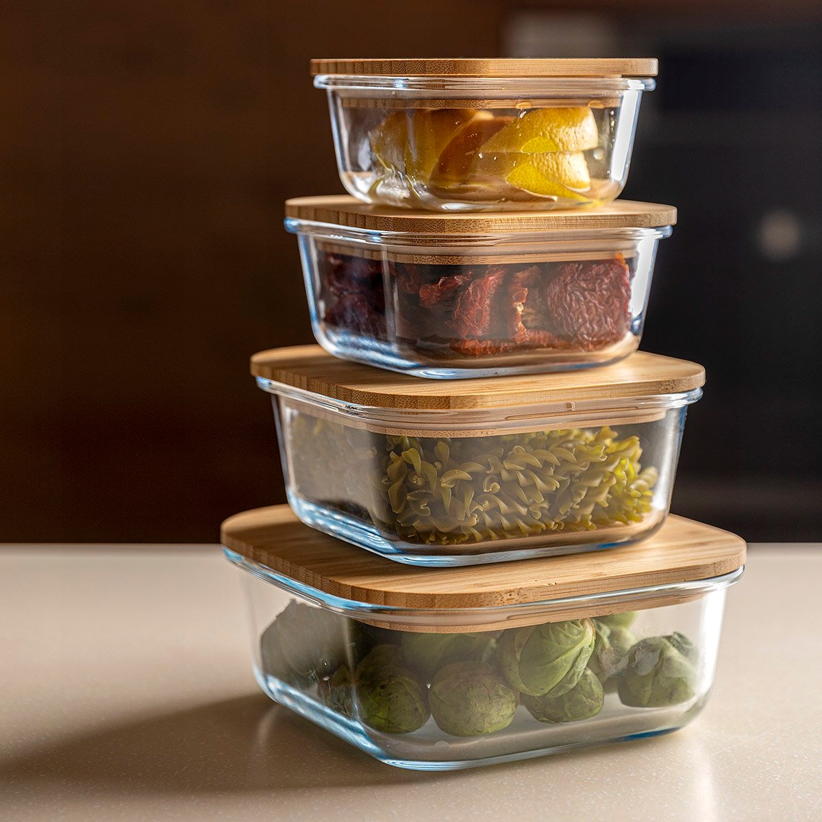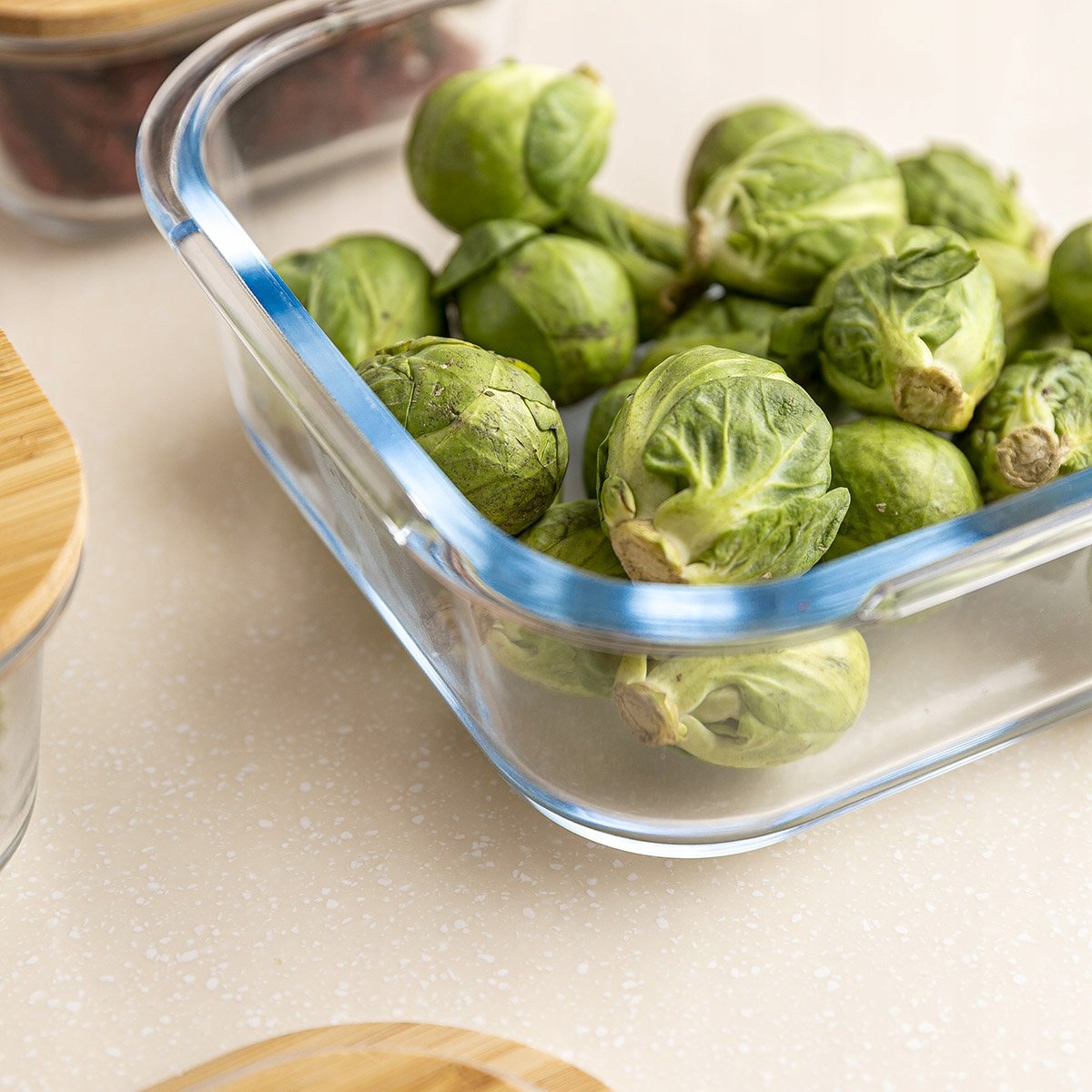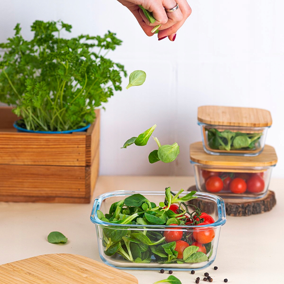 Стеклянный контейнер с бамбуковой крышкой идеально подходит для хранения продуктов в холодильнике. Также форму можно использовать для запекания, разогрева в микроволновой печи и замораживания продуктов.