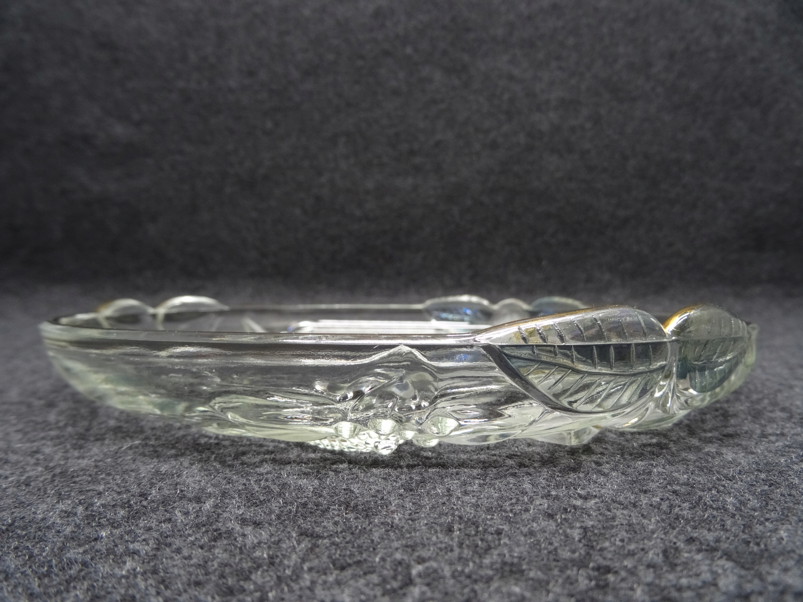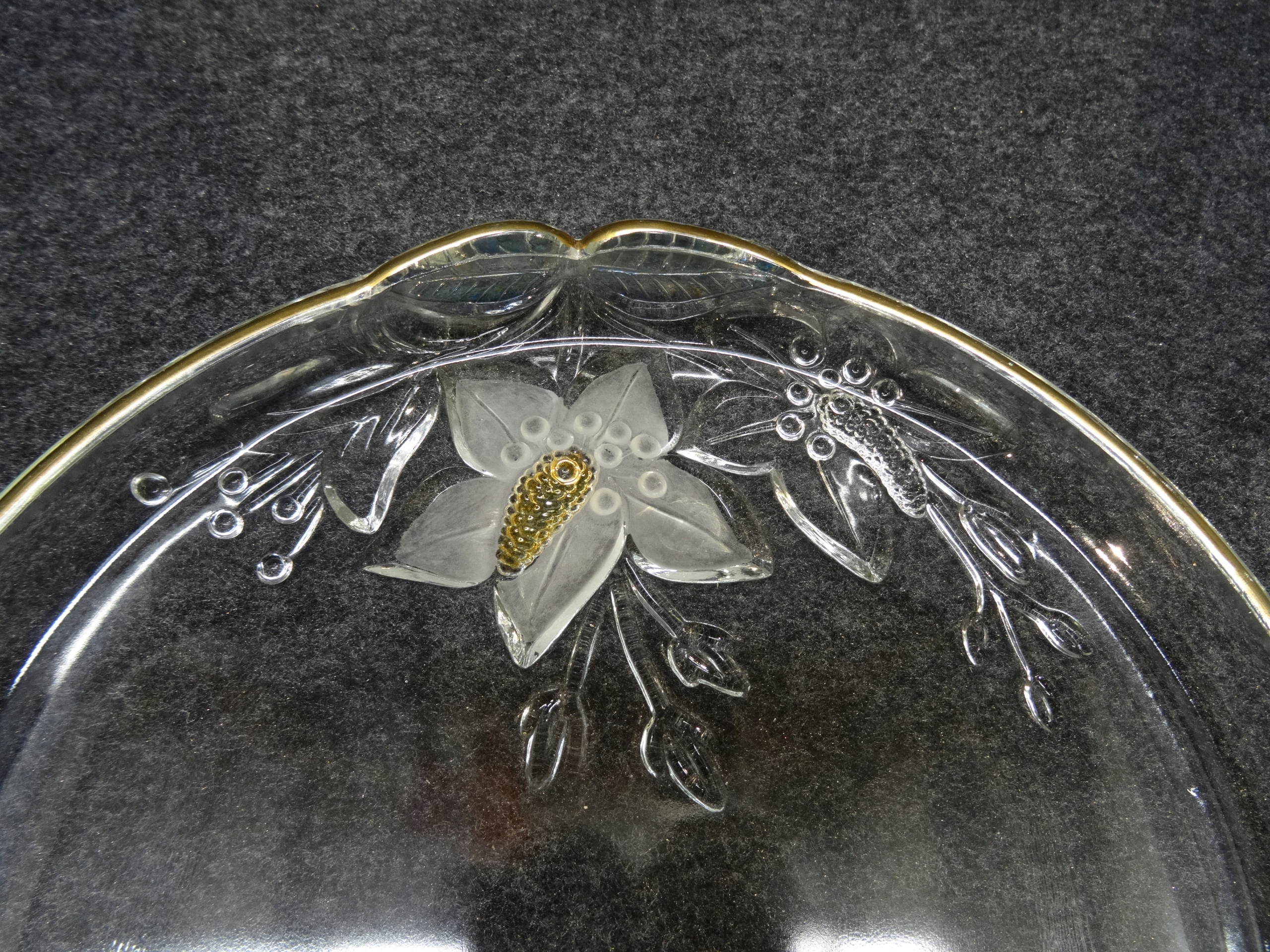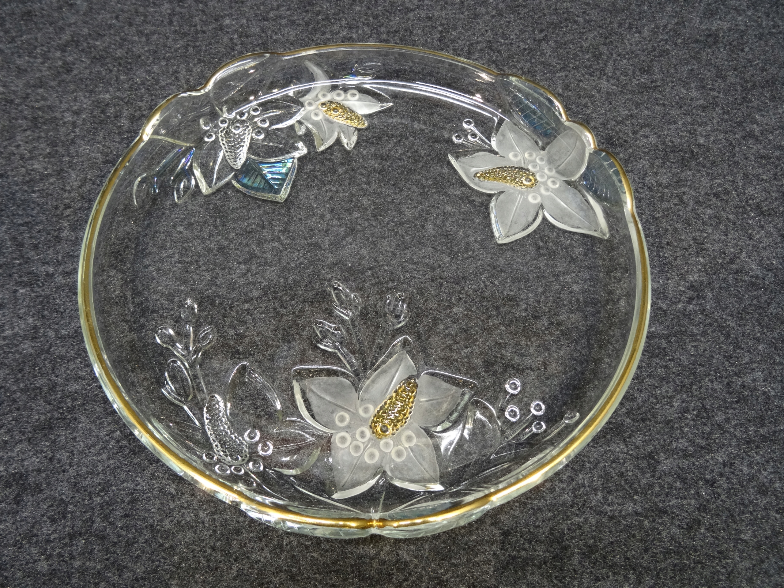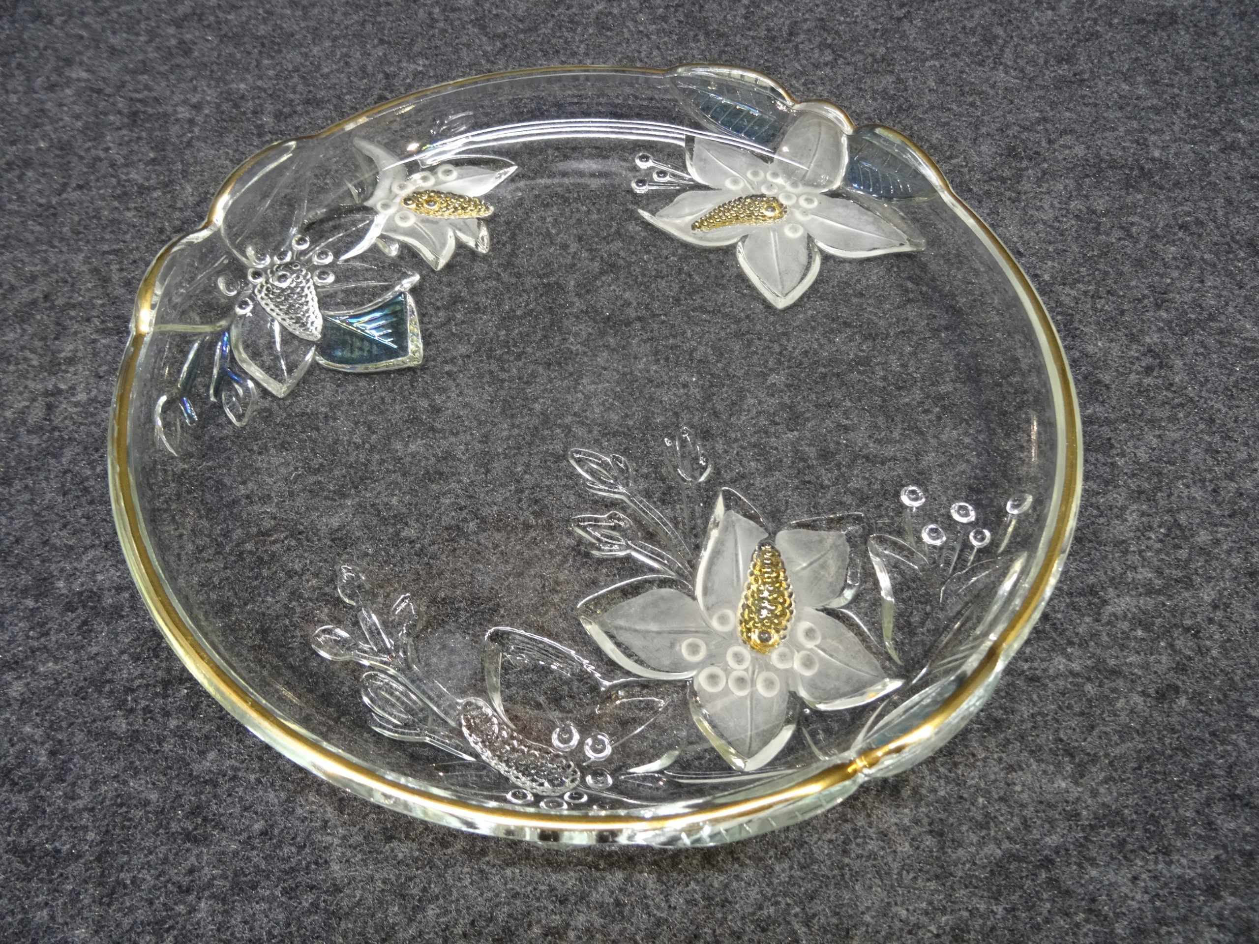 Декоративный стеклянный поднос с тиснением на дне цветочного узора. Пластина внутри гладкая, по краю позолоченная.