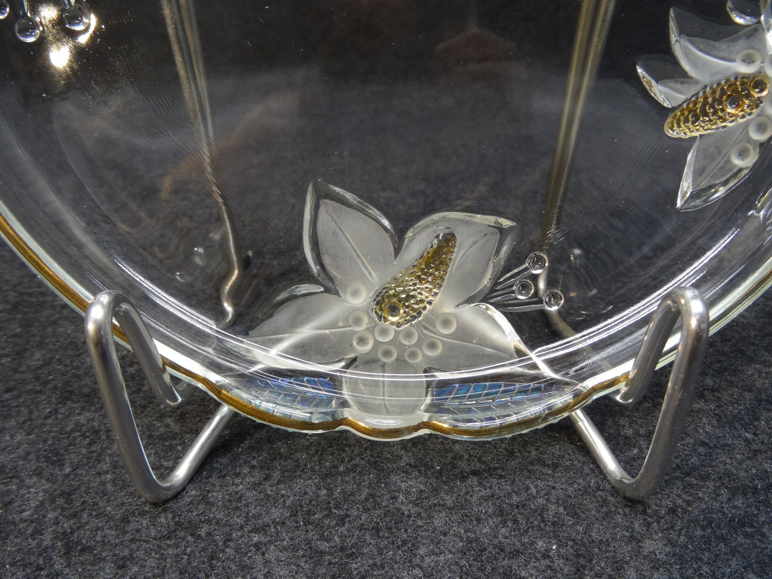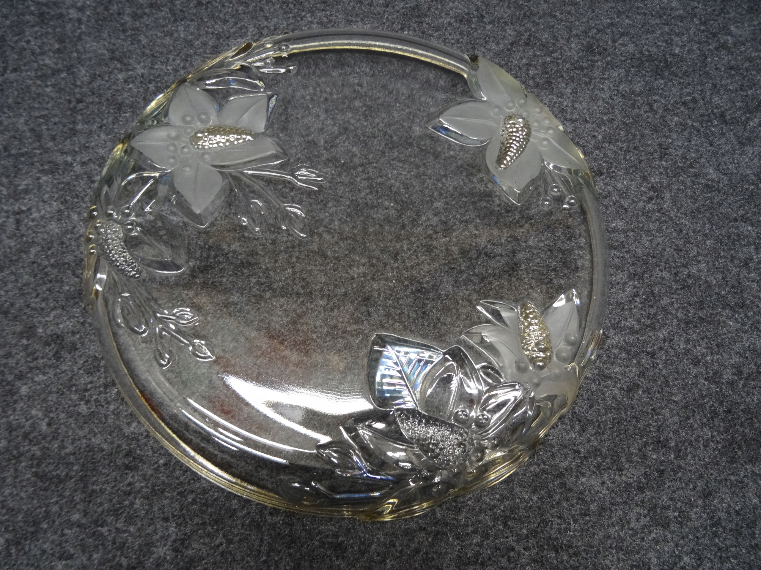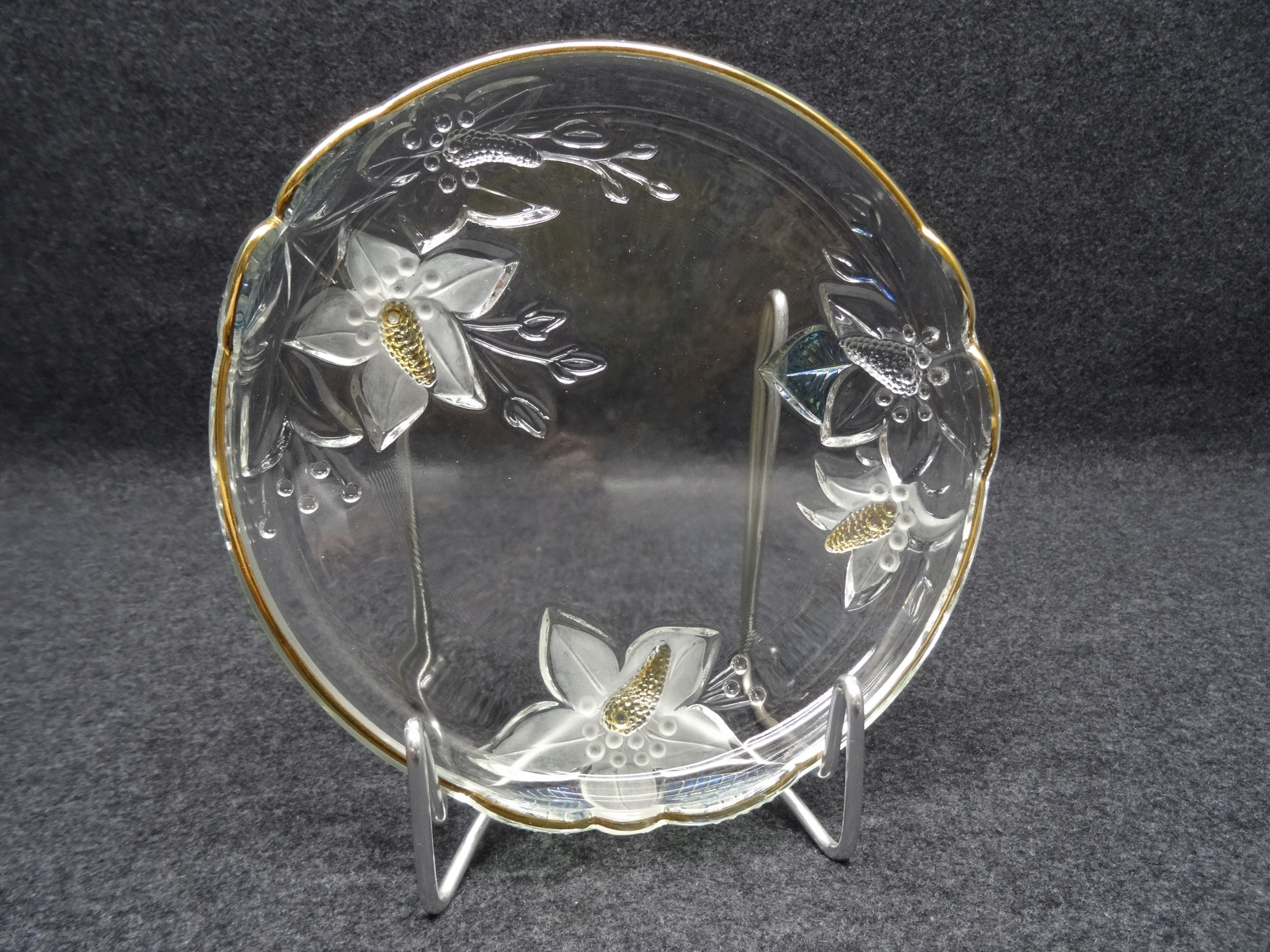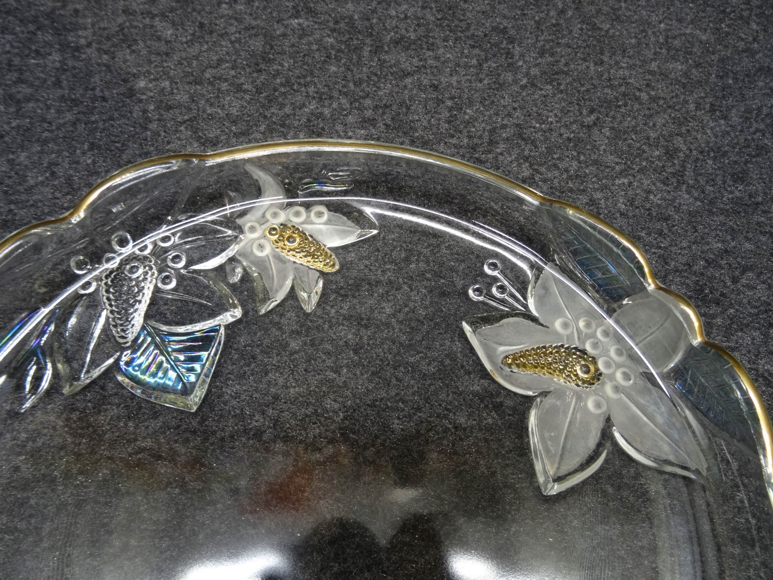 Декоративный стеклянный поднос с тиснением на дне цветочного узора. Пластина внутри гладкая, по краю позолоченная.