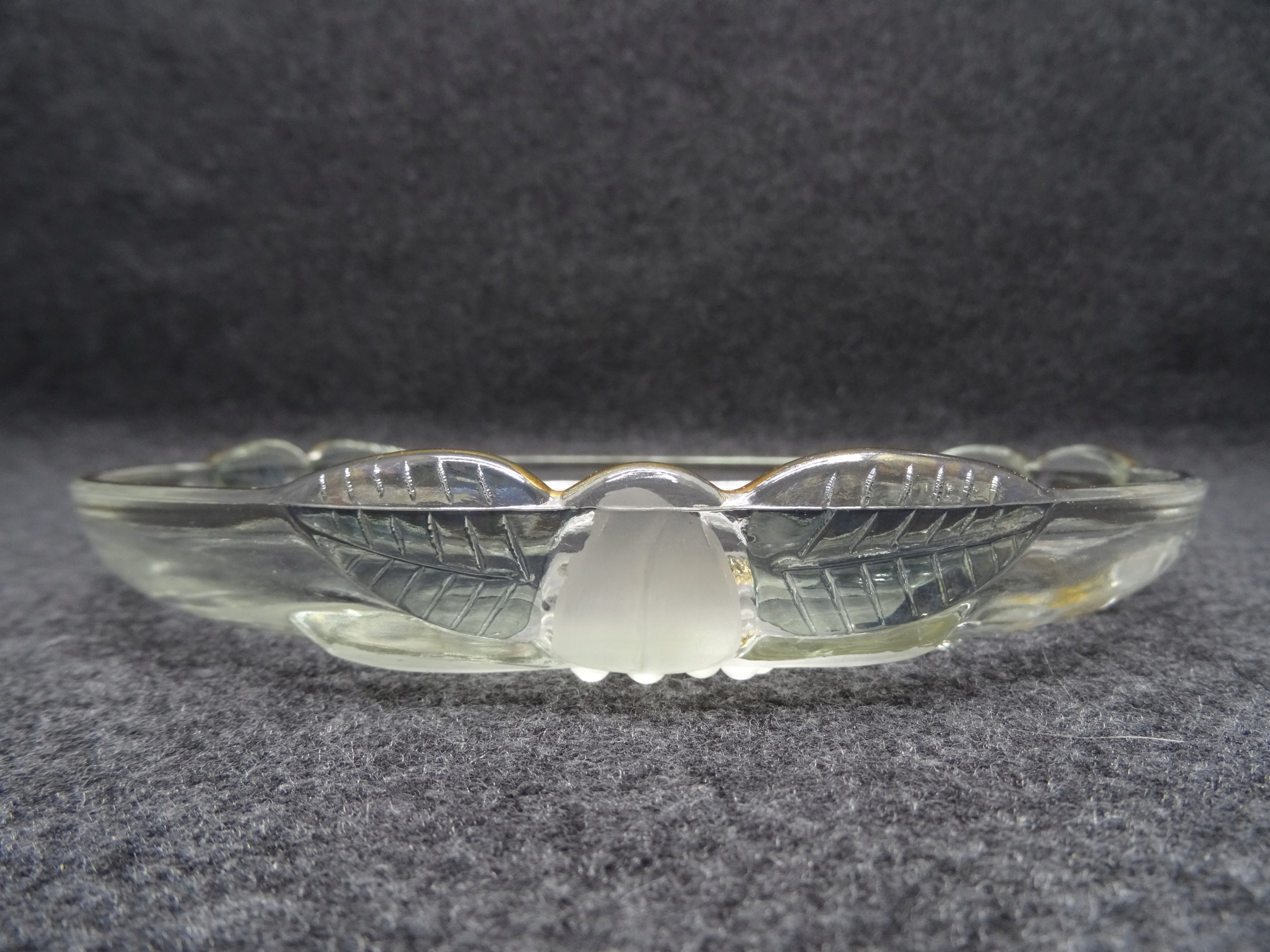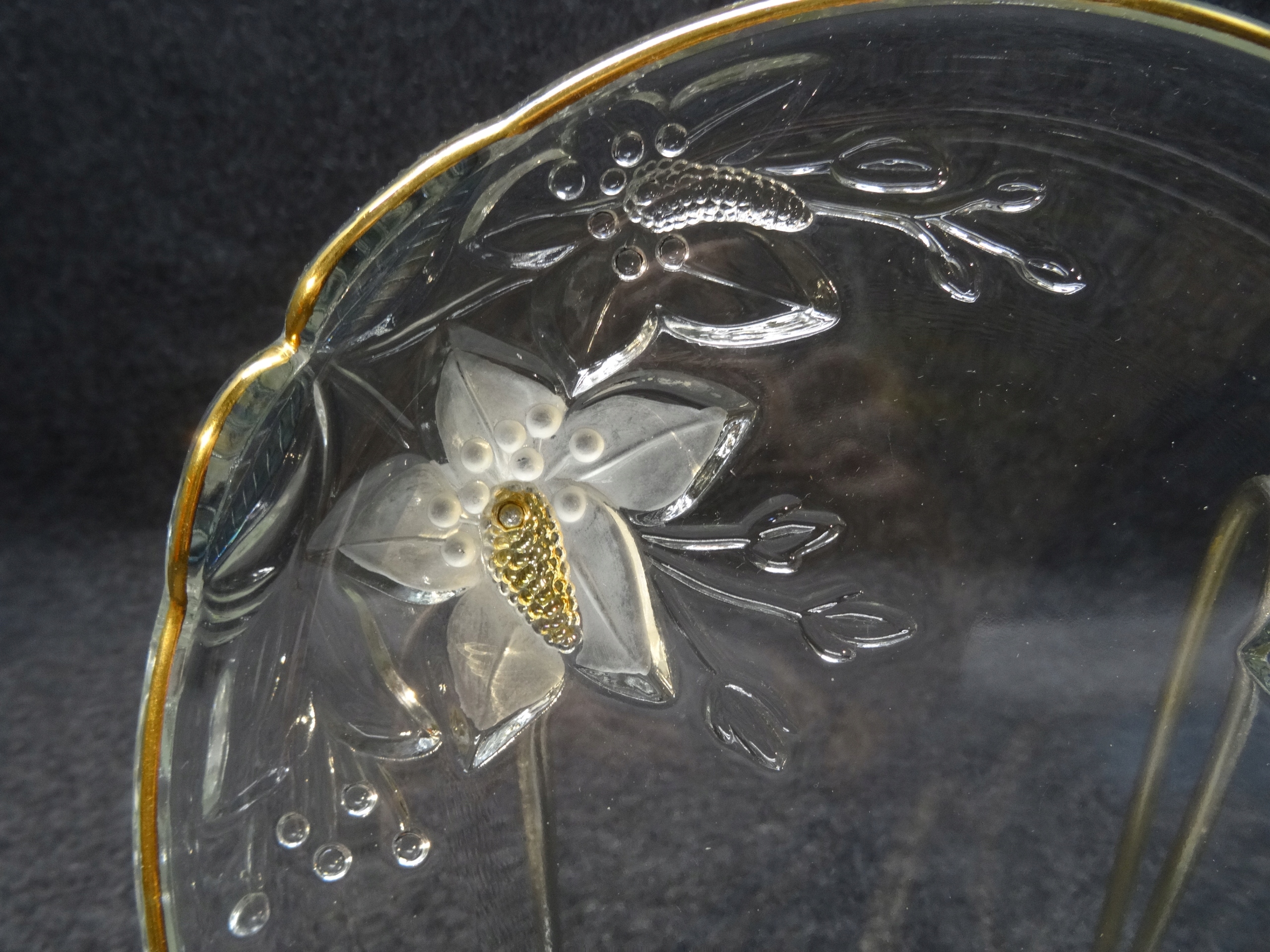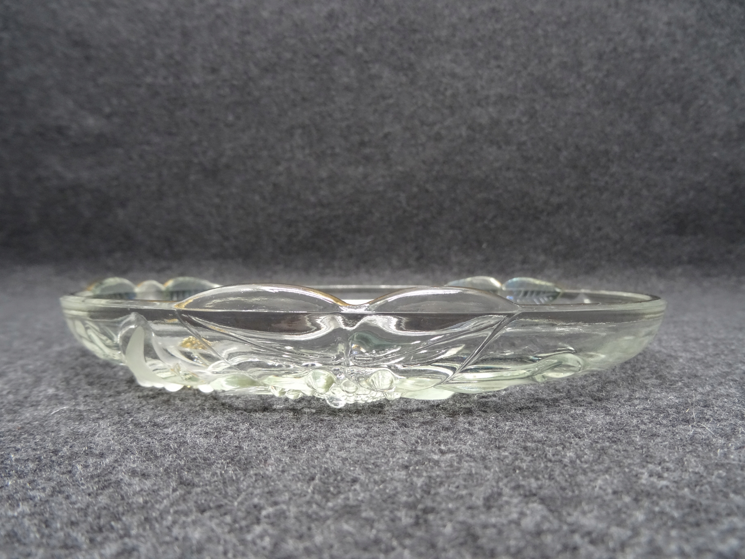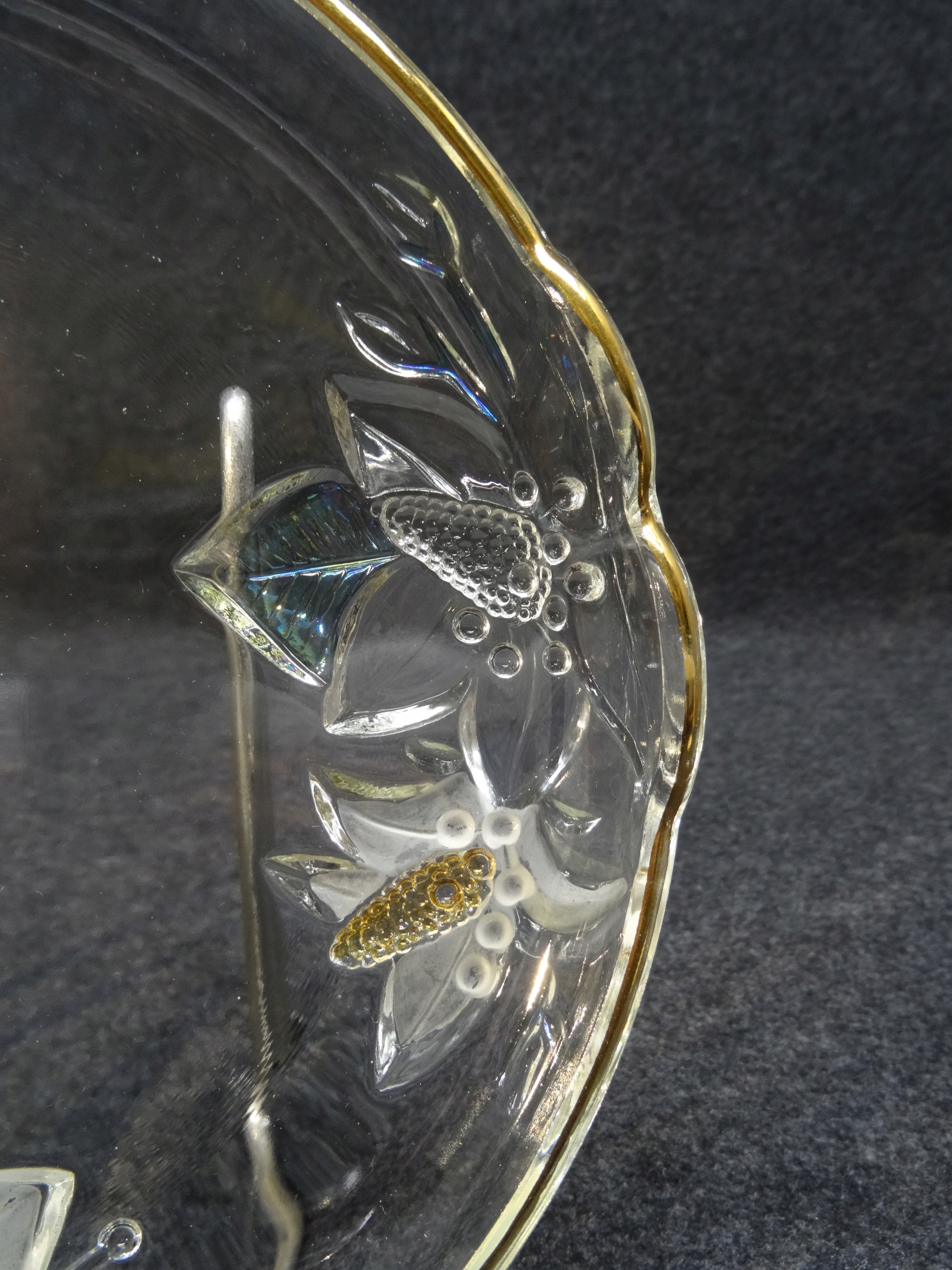 Декоративный стеклянный поднос с тиснением на дне цветочного узора. Пластина внутри гладкая, по краю позолоченная.