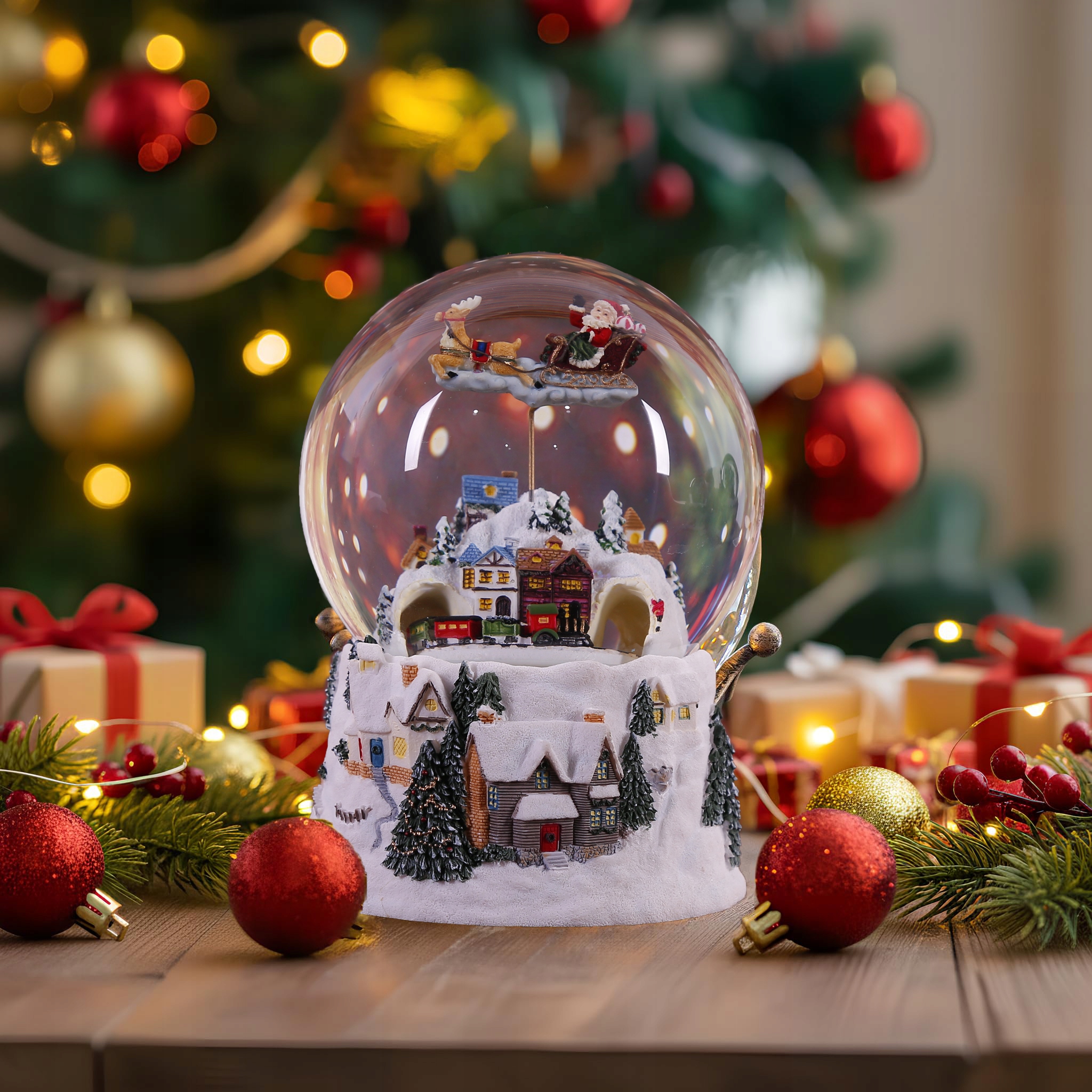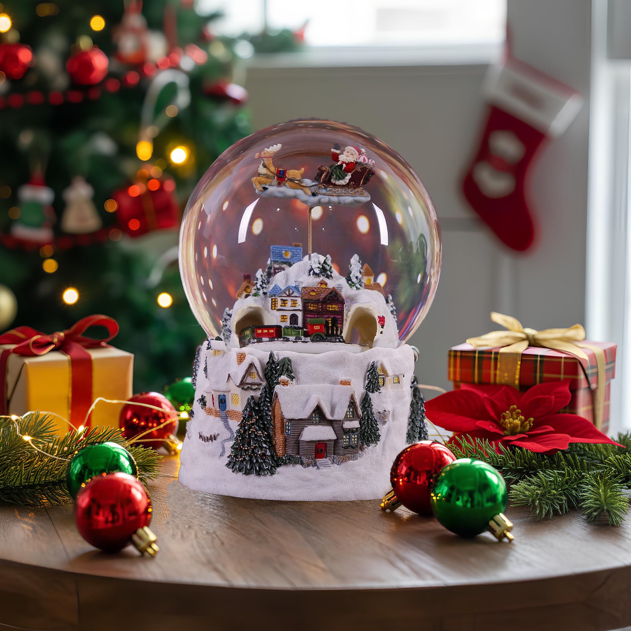 Этот инновационный, единственный в своем роде шедевр сочетает в себе волшебную обстановку заснеженного коттеджа, летающих оленей, тянущих сани Санты, заснеженную гору и кружащийся у ее подножья поезд - все это оживает и вращается в ритме рождественской музыки и нежных светодиодных огней, новый рождественский подарок на Рождество 2025 года!