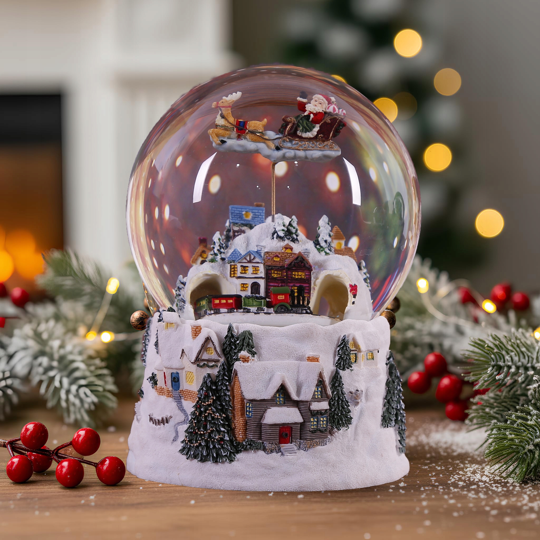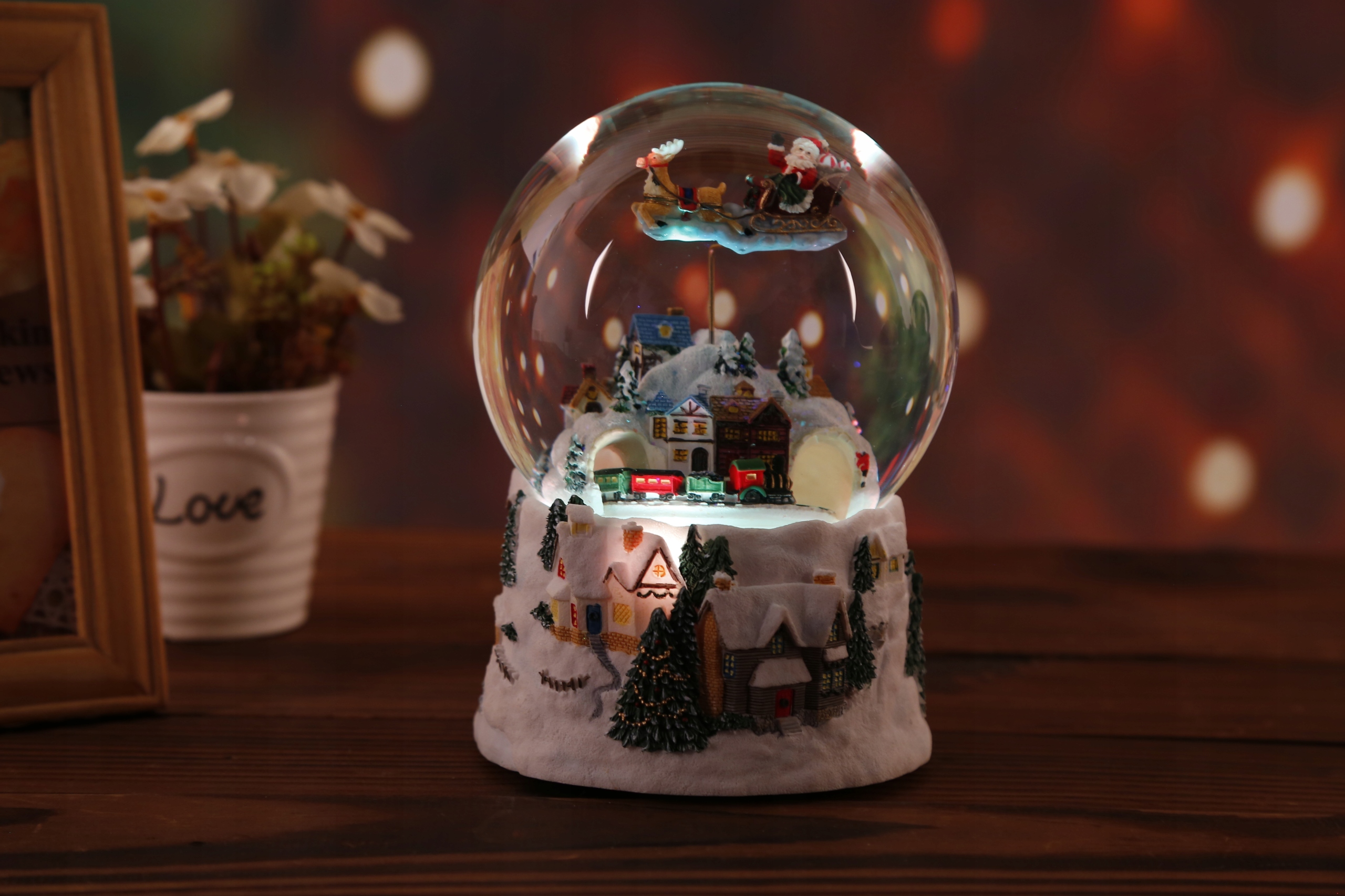 Основание рождественского снежного шара имитирует заснеженный зимний пейзаж с коттеджем, окруженным елками и ровным снегом. Дед Мороз плывет в хрустальном шаре на санях, запряженных летящими оленями, передвигаясь по заснеженной горе, у подножия которой по рельсам скользит небольшой поезд с подарками.