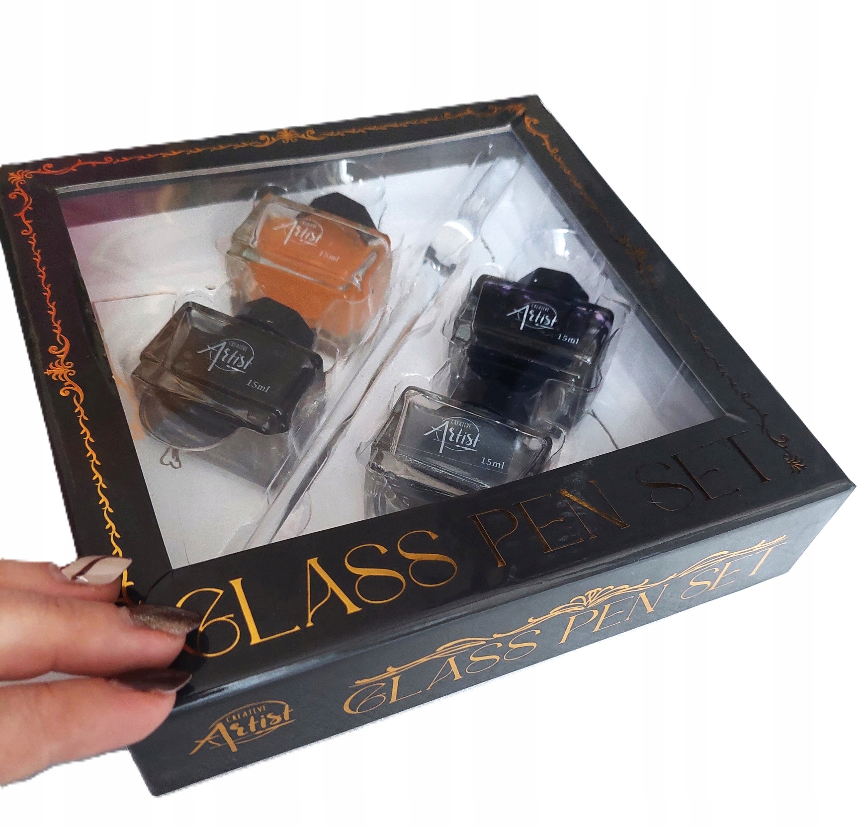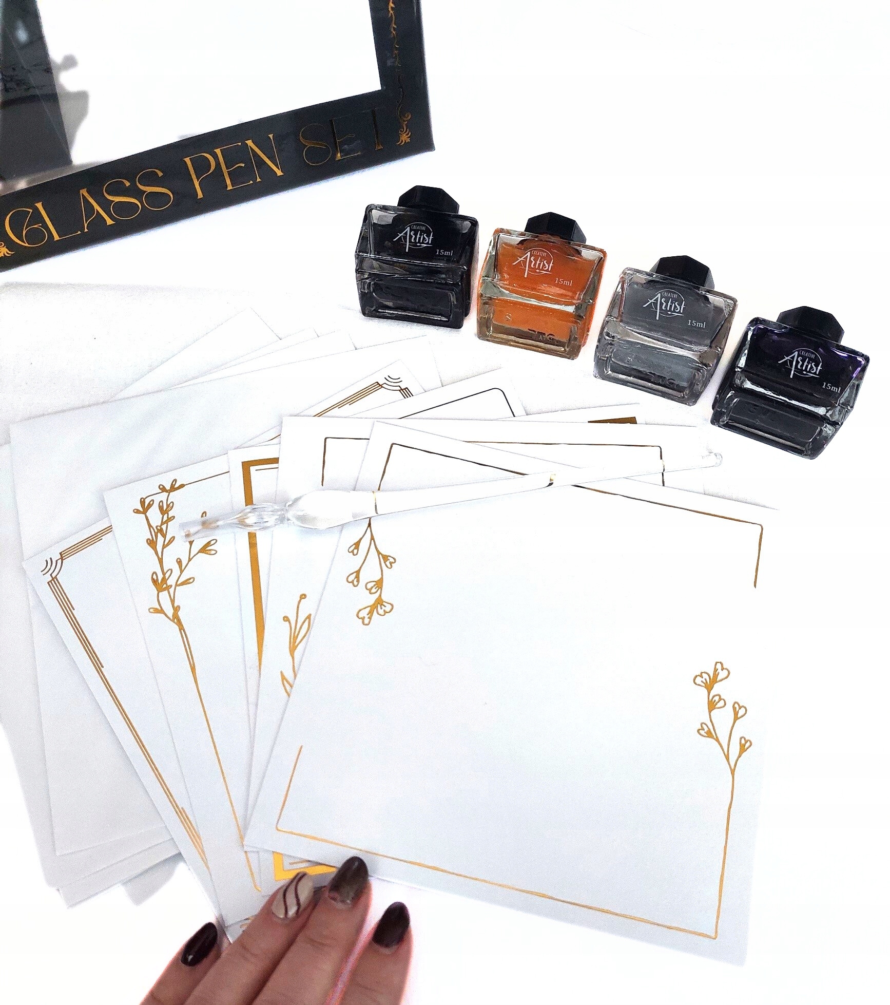 СКЛЯНА РУЧКА КАЛІГРАФІЧНИЙ НАБІР ЧОРНИЛА 4 х 15 мл КАРТКИ ПОДАРУНКОВІ конверти