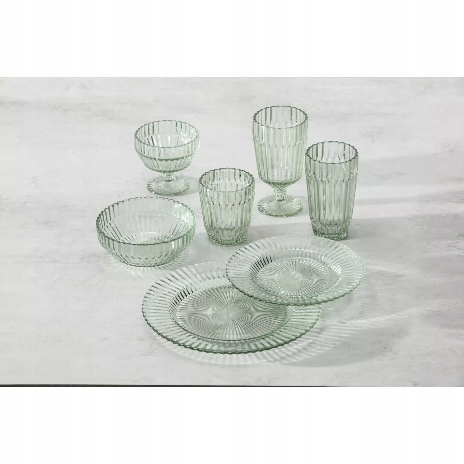 В предложении представлены стаканы разных размеров, графины, миски и тарелки, выполненные в едином стиле. Изделия изготовлены из прочного натриевого стекла, пригодного для мытья в посудомоечной машине и интенсивного использования.