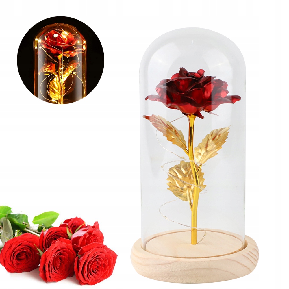 Стеклянная вечная красная роза со светодиодной деревянной основой