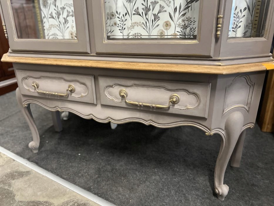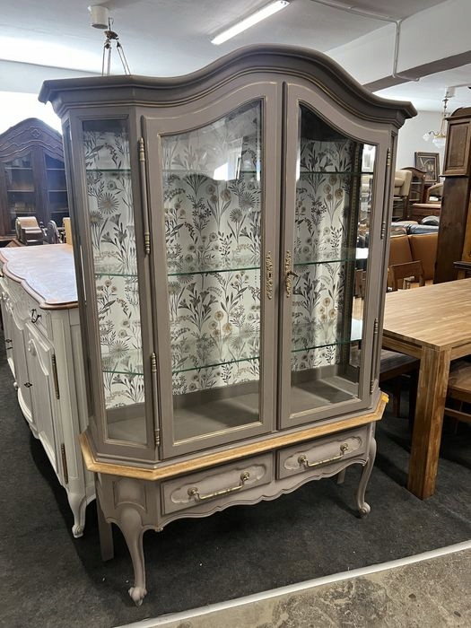 Предмет продажи — красивая и очаровательная стеклянная витрина из Людвикова после метаморфозы. Очень хорошее состояние. Написана бежевыми/серыми меловыми красками, растушевана по ящикам. Слегка отделано золотом. Защищен воском. Обои на спине и в ящиках. Вживую выглядит красиво. Возможность покупки в рассрочку. Возможен транспорт или личный самовывоз. Товар доступен в магазине в Пионках.