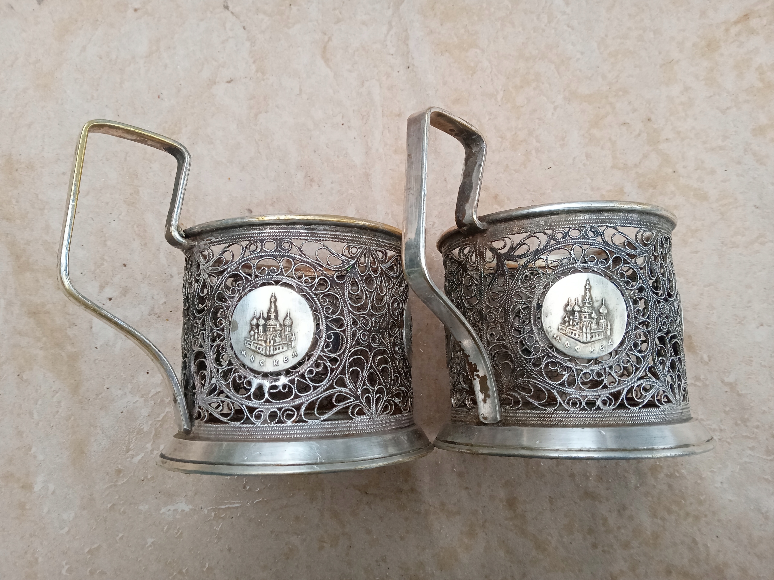 Цена за 2 шт., посеребрение, потертости серебрения, загрязнения, высота с ручкой ок. 9 см, диаметр верхнего края ок. 6,5 см, состояние как на фото, без потертостей и трещин, небольшие потертости