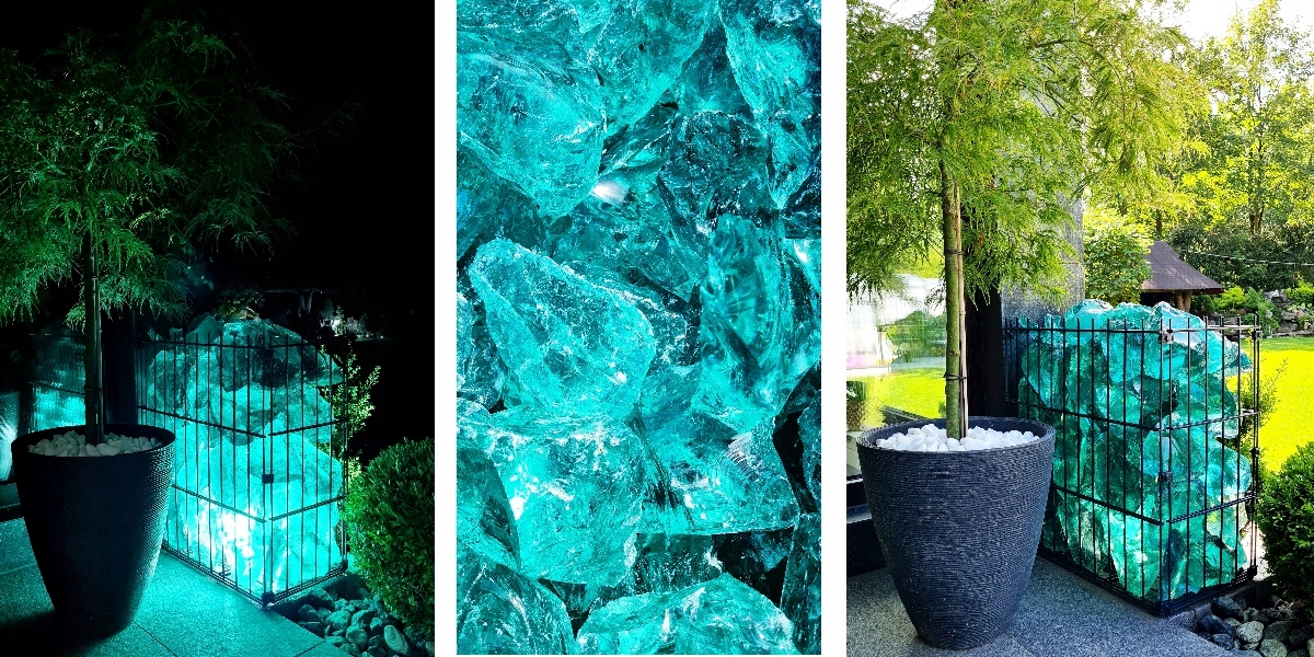 В свете солнца и при сиянии луны они выглядят как блестящие сосульки. Декоративное стекло предназначено для обустройства садов, интерьеров и, прежде всего, заполнение габионов. Они подходят, среди прочего: для создания декораций на мелком гравии, газоне, под деревом, возле пруда, фонтана, аквариума или на террасе.