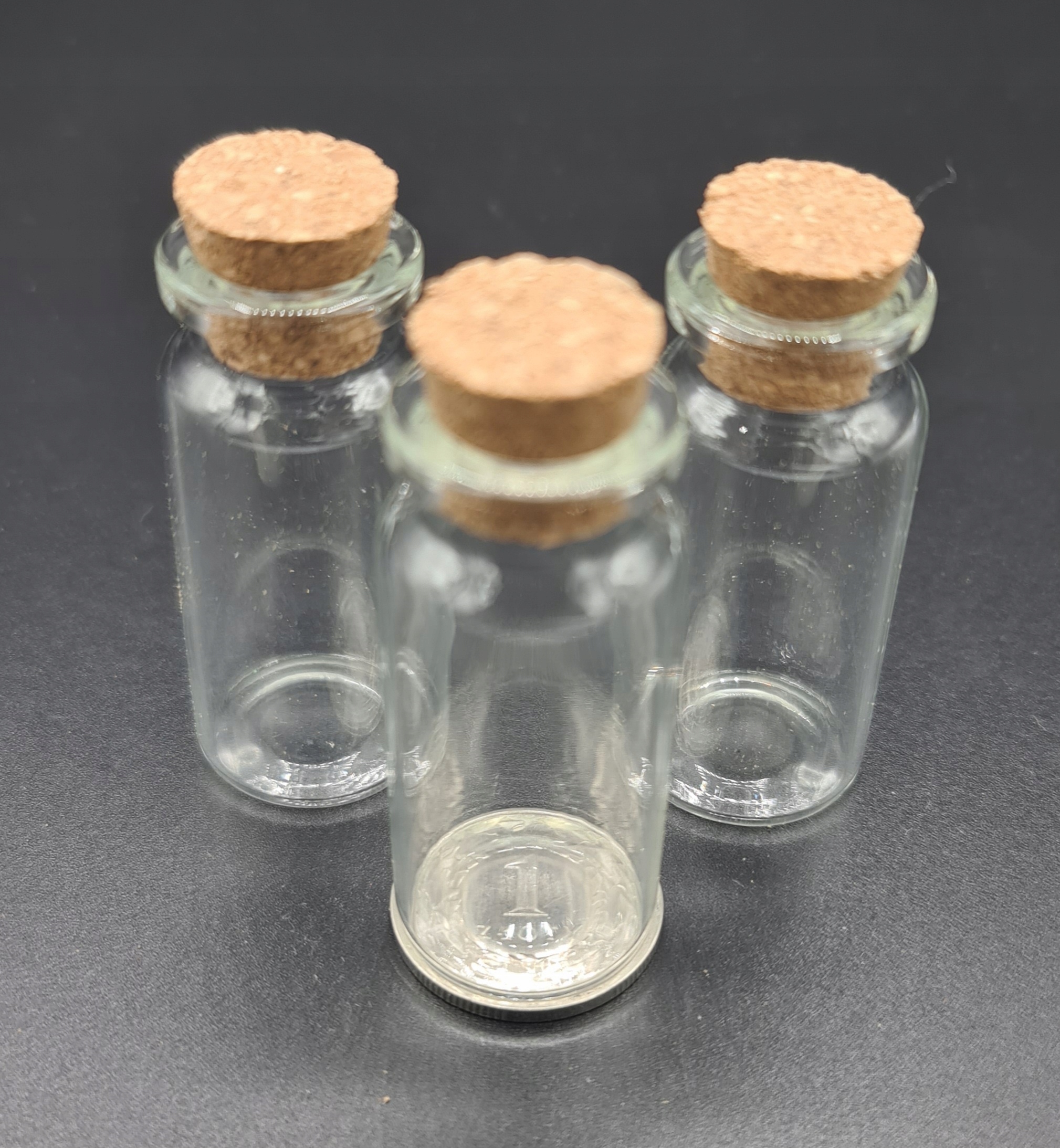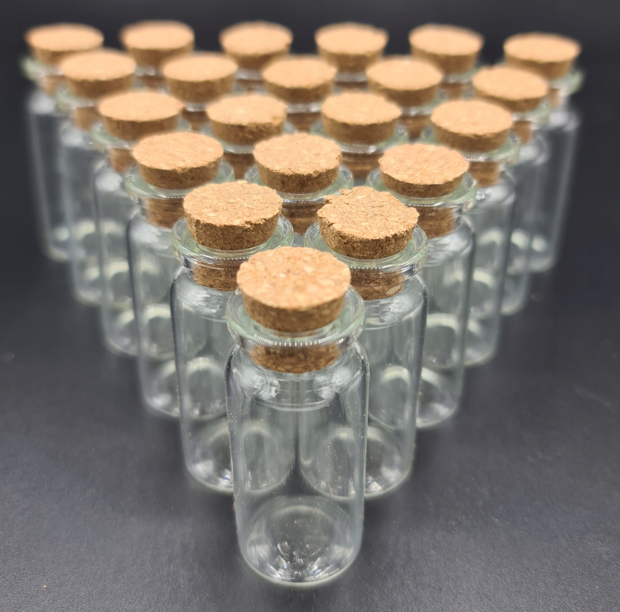 Набор из 50 стеклянных, прозрачных бутылок с пробками.
